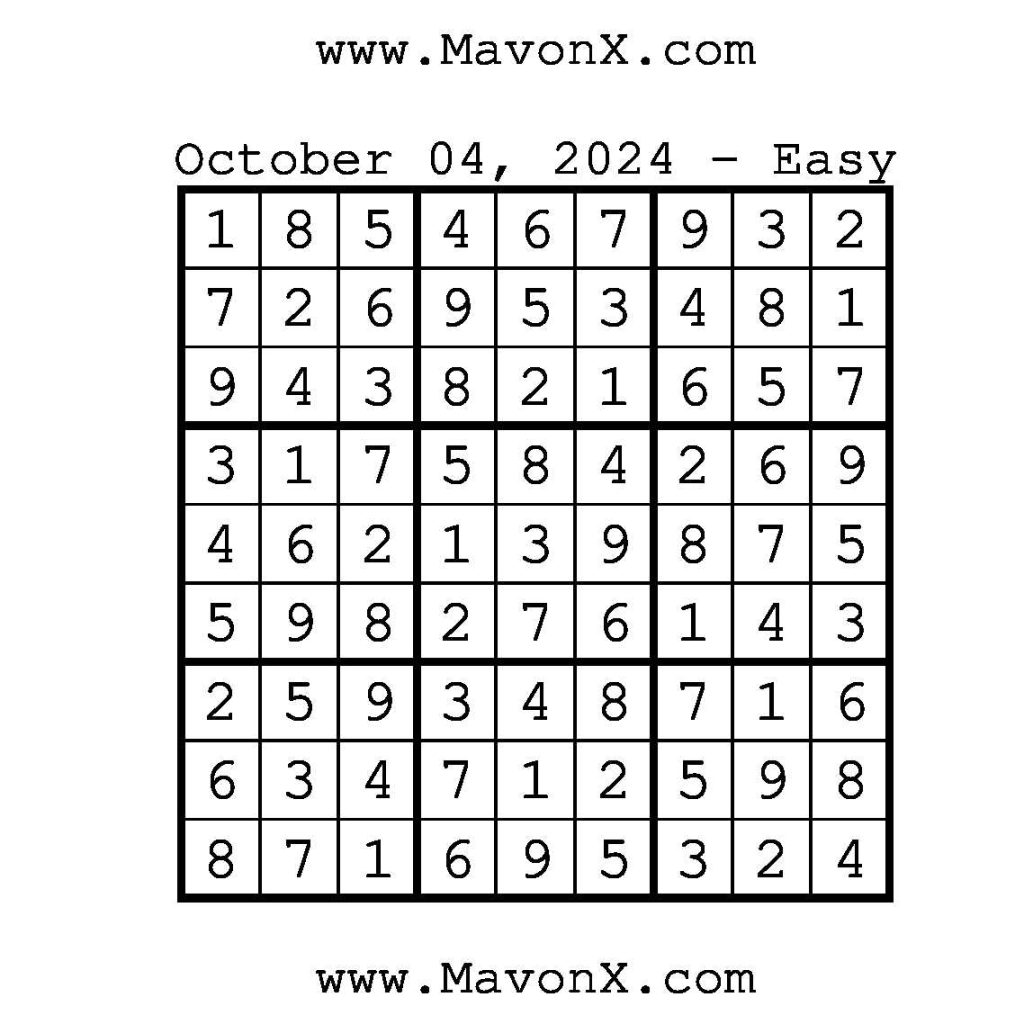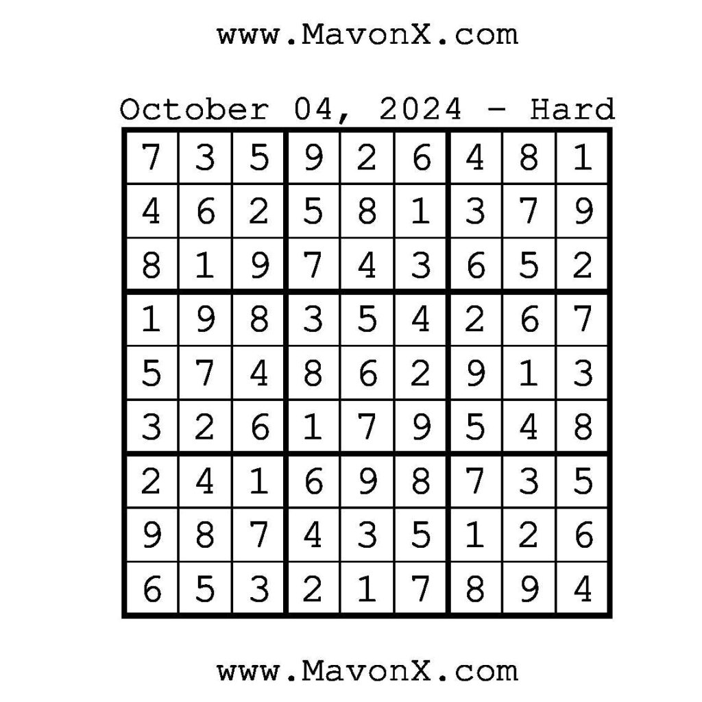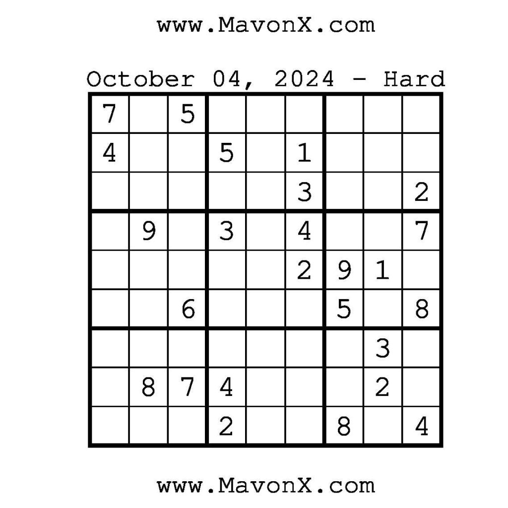 Puzzles of the Day – October 4, 2024 Post author:admin Post published:October 4, 2024 Post category:Free Stuff / Puzzle of the Day / Puzzle of the Day Solutions / Solutions Post comments:0 Comments Check out our books on Amazon!!!!! Easy Sudoku Coach Link Medium Sudoku Coach Link Hard Sudoku Coach Link Show Solution You Might Also Like Puzzles of the Day – April 6, 2025 April 6, 2025 Puzzle of the Day – July 5, 2024 July 5, 2024 Puzzles of the Day – June 4, 2025 June 3, 2025 Leave a Reply Cancel replyCommentEnter your name or username to comment Enter your email address to comment Enter your website URL (optional) Save my name, email, and website in this browser for the next time I comment.