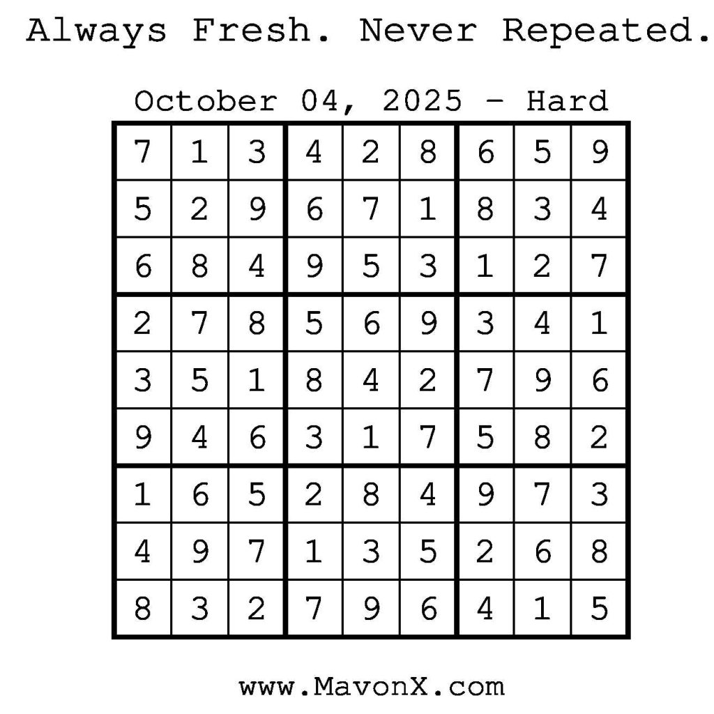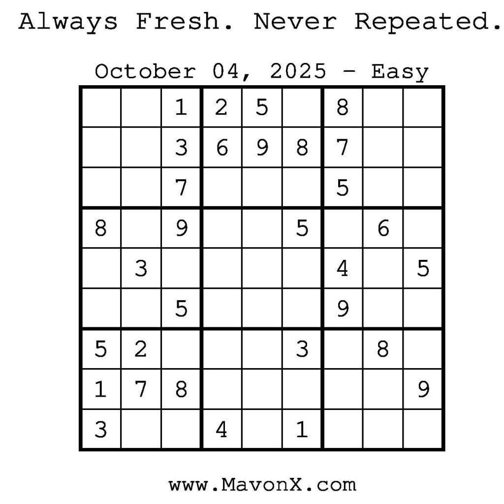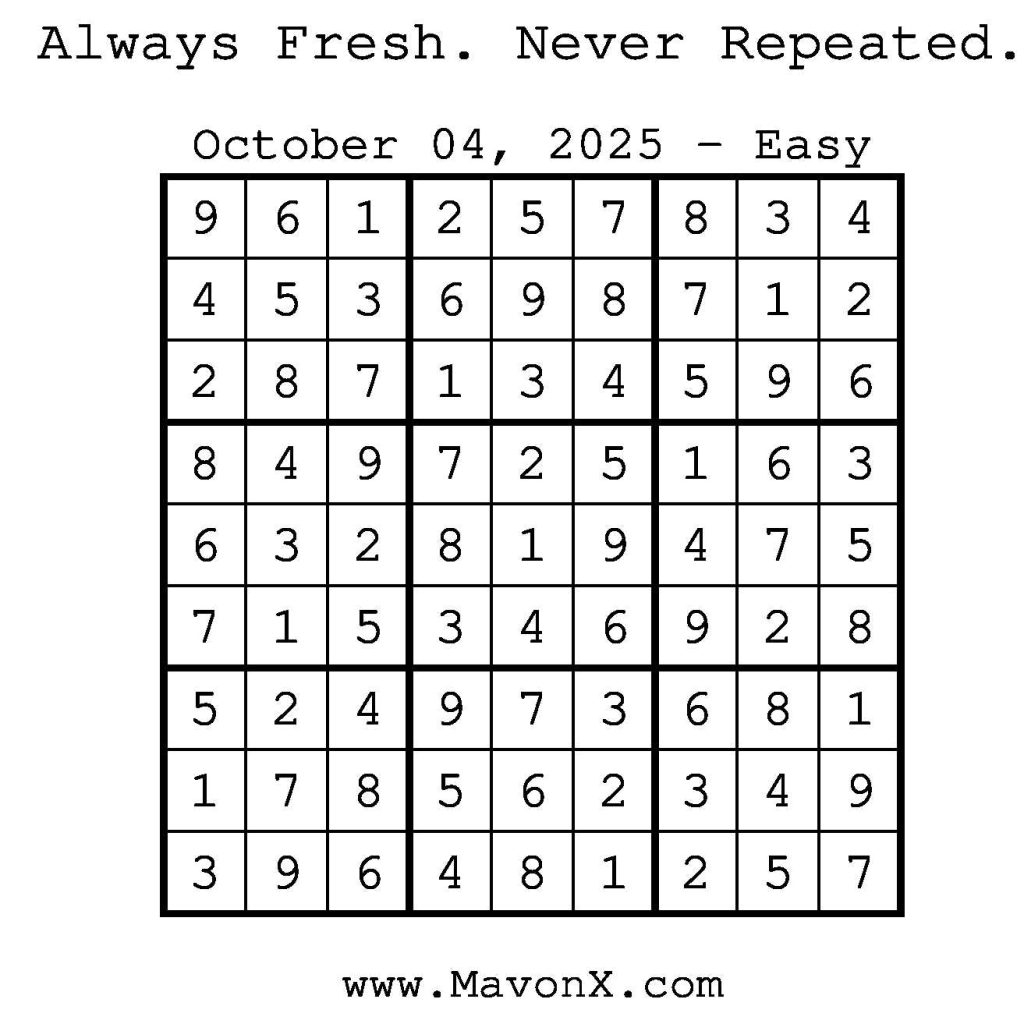 Puzzles of the Day – October 4, 2025 Post author:admin Post published:October 3, 2025 Post category:Free Stuff / Puzzle of the Day / Puzzle of the Day Solutions / Solutions Post comments:0 Comments Check out our books on Amazon! Check out our books on Barnes and Noble! Check out our books on Etsy! Easy Sudoku Coach Link Medium Sudoku Coach Link Hard Sudoku Coach Link Show Solution You Might Also Like Puzzles of the Day – October 28, 2025 October 28, 2025 Puzzles of the Day – December 1, 2024 December 1, 2024 Puzzles of the Day – December 30, 2025 December 30, 2025 Leave a Reply Cancel replyCommentEnter your name or username to comment Enter your email address to comment Enter your website URL (optional) Save my name, email, and website in this browser for the next time I comment.