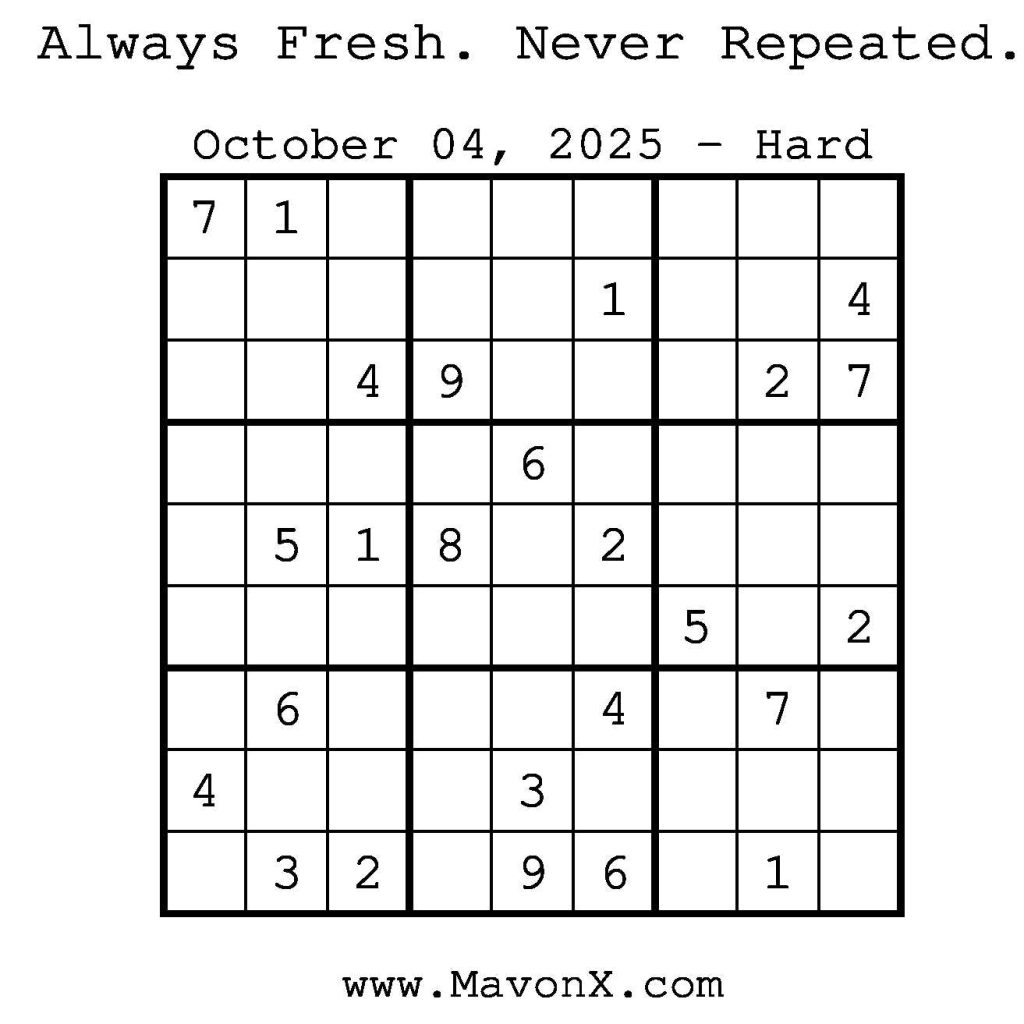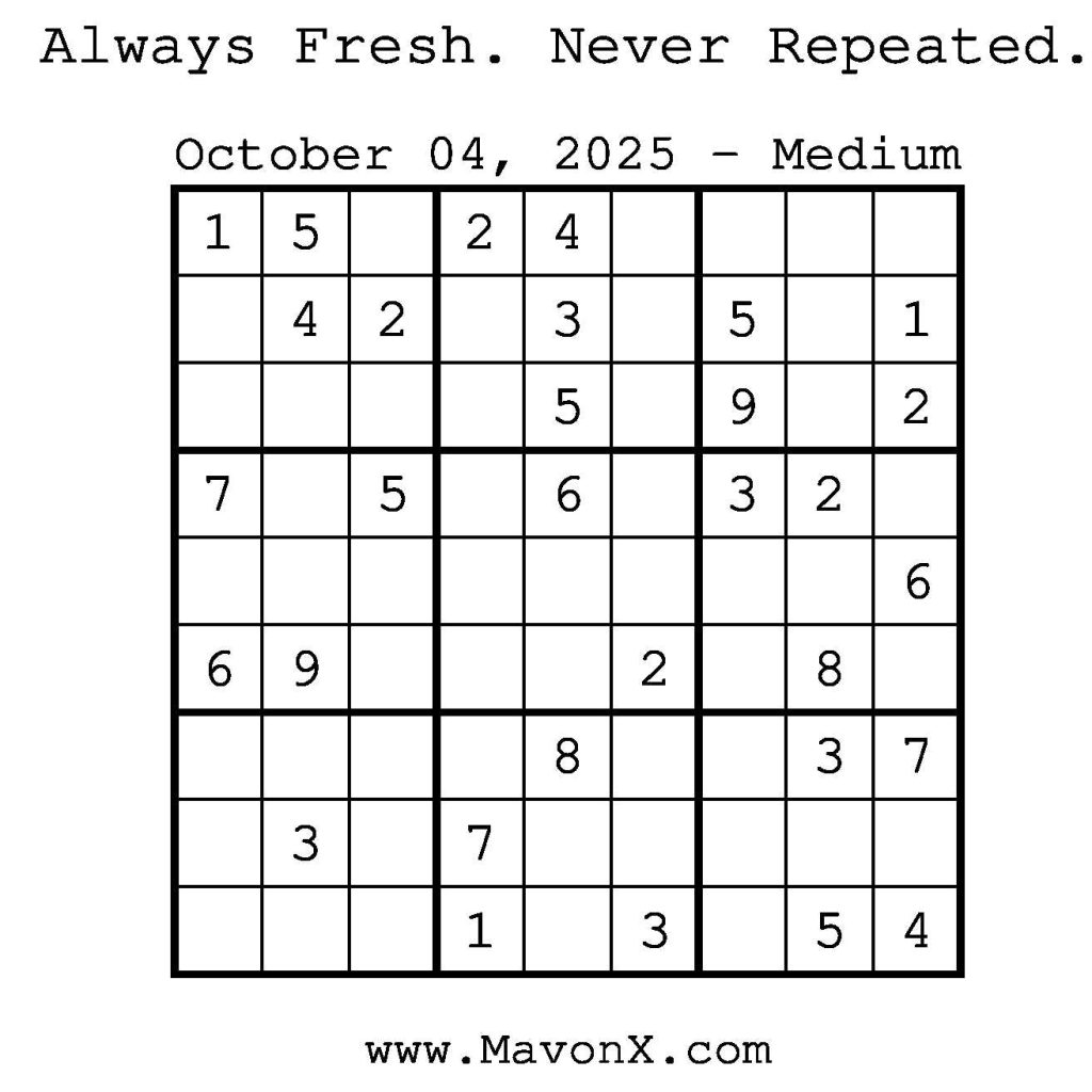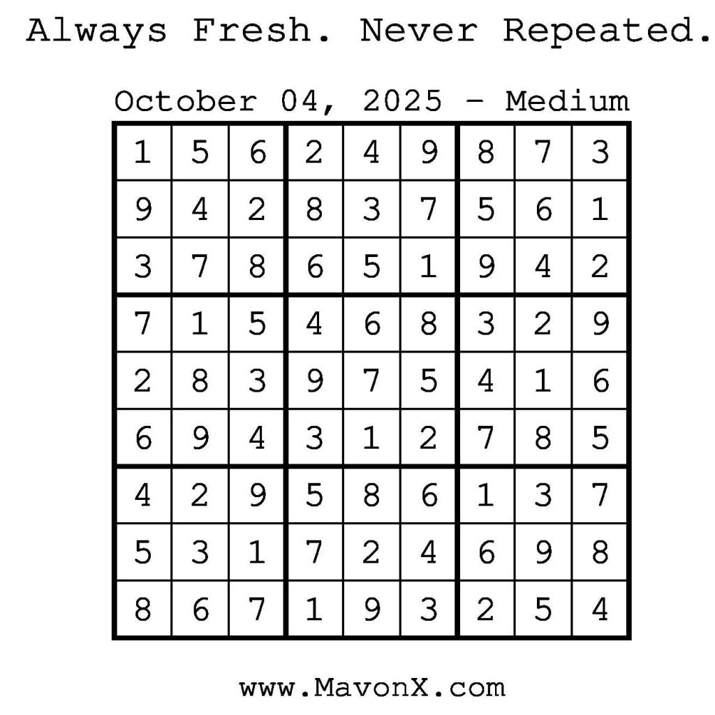 Puzzles of the Day – October 4, 2025 Post author:admin Post published:October 3, 2025 Post category:Free Stuff / Puzzle of the Day / Puzzle of the Day Solutions / Solutions Post comments:0 Comments Check out our books on Amazon! Check out our books on Barnes and Noble! Check out our books on Etsy! Easy Sudoku Coach Link Medium Sudoku Coach Link Hard Sudoku Coach Link Show Solution You Might Also Like Puzzles of the Day – October 28, 2025 October 28, 2025 Puzzles of the Day – December 1, 2024 December 1, 2024 Puzzles of the Day – December 30, 2025 December 30, 2025 Leave a Reply Cancel replyCommentEnter your name or username to comment Enter your email address to comment Enter your website URL (optional) Save my name, email, and website in this browser for the next time I comment.