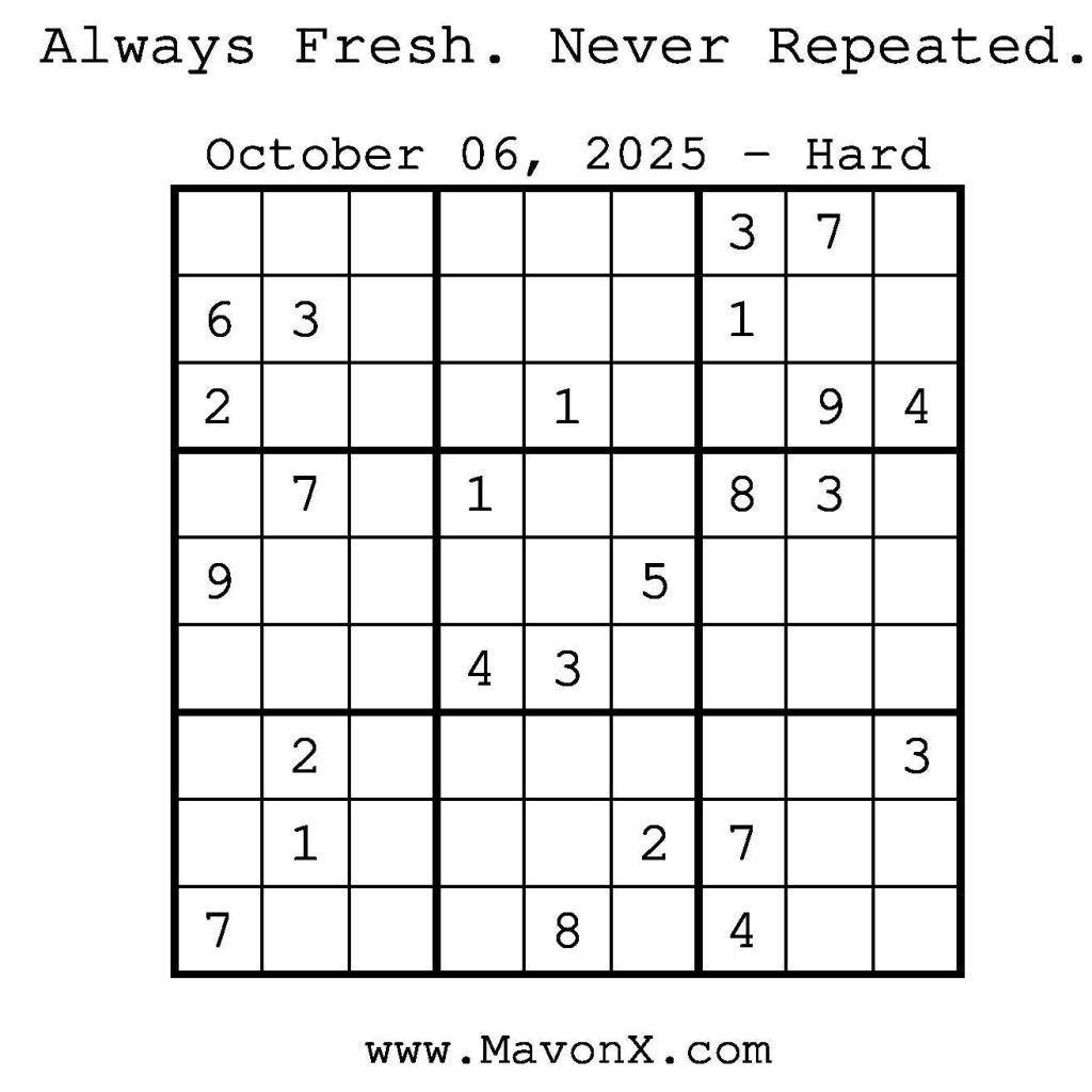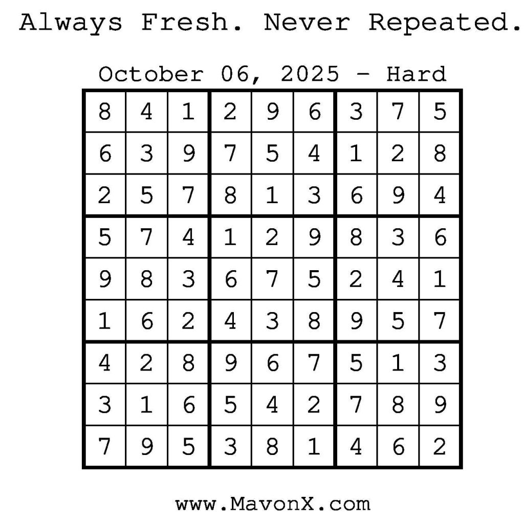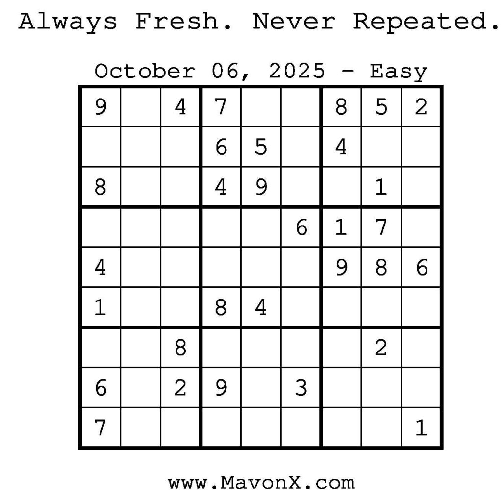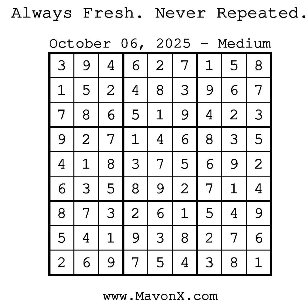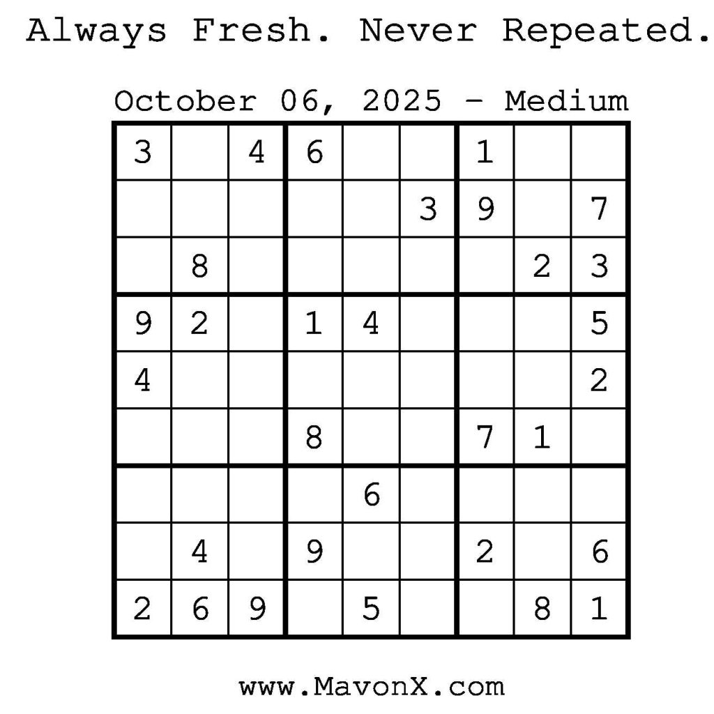 Puzzles of the Day – October 6, 2025 Post author:admin Post published:October 6, 2025 Post category:Free Stuff / Puzzle of the Day / Puzzle of the Day Solutions / Solutions Post comments:0 Comments Check out our books on Amazon! Check out our books on Barnes and Noble! Check out our books on Etsy! Easy Sudoku Coach Link Medium Sudoku Coach Link Hard Sudoku Coach Link Show Solution You Might Also Like Puzzles of the Day – February 22, 2025 February 21, 2025 Puzzles of the Day – July 21, 2025 July 21, 2025 Puzzles of the Day – March 2, 2025 March 2, 2025 Leave a Reply Cancel replyCommentEnter your name or username to comment Enter your email address to comment Enter your website URL (optional) Save my name, email, and website in this browser for the next time I comment.