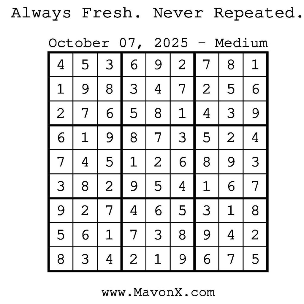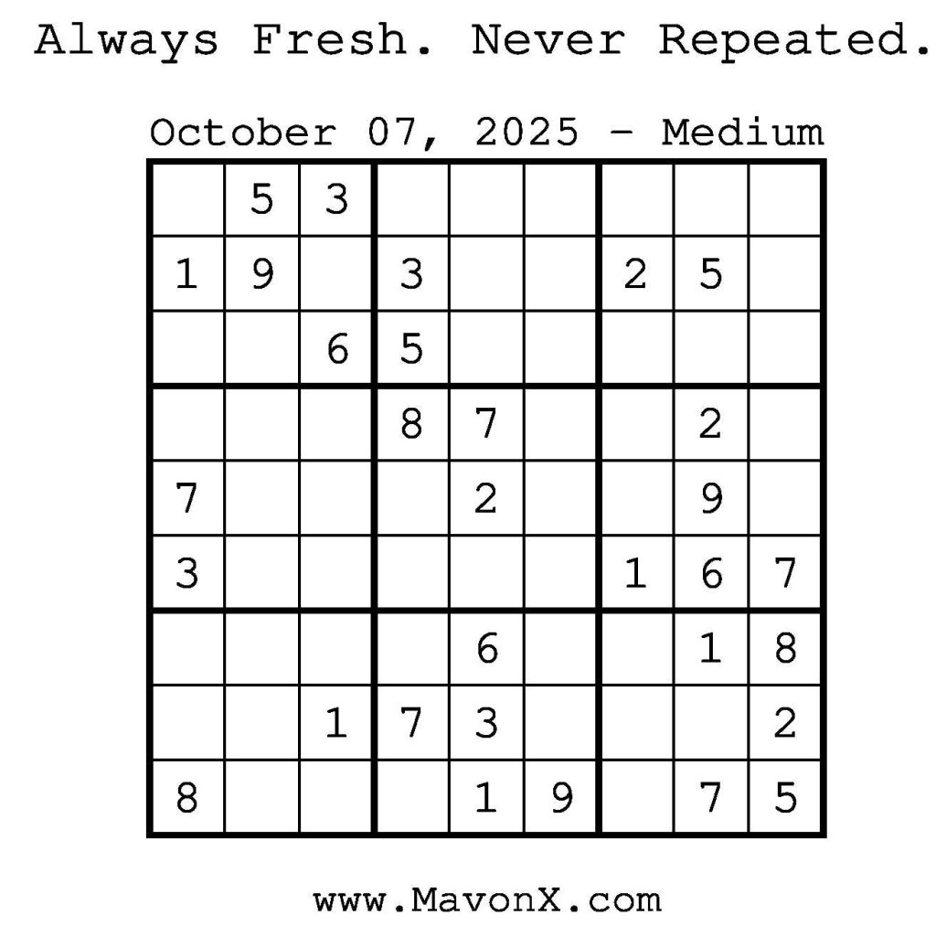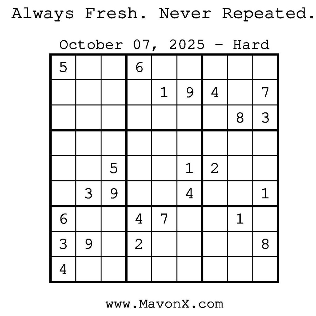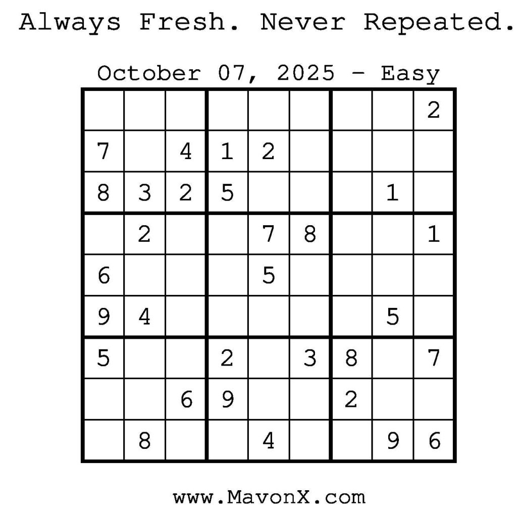 Puzzles of the Day – October 7, 2025 Post author:admin Post published:October 6, 2025 Post category:Free Stuff / Puzzle of the Day / Puzzle of the Day Solutions / Solutions Post comments:0 Comments Check out our books on Amazon! Check out our books on Barnes and Noble! Check out our books on Etsy! Easy Sudoku Coach Link Medium Sudoku Coach Link Hard Sudoku Coach Link Show Solution You Might Also Like Puzzles of the Day – February 24, 2025 February 25, 2025 Puzzles of the Day – April 10, 2026 April 10, 2026 Puzzles of the Day – December 20, 2025 December 19, 2025 Leave a Reply Cancel replyCommentEnter your name or username to comment Enter your email address to comment Enter your website URL (optional) Save my name, email, and website in this browser for the next time I comment.