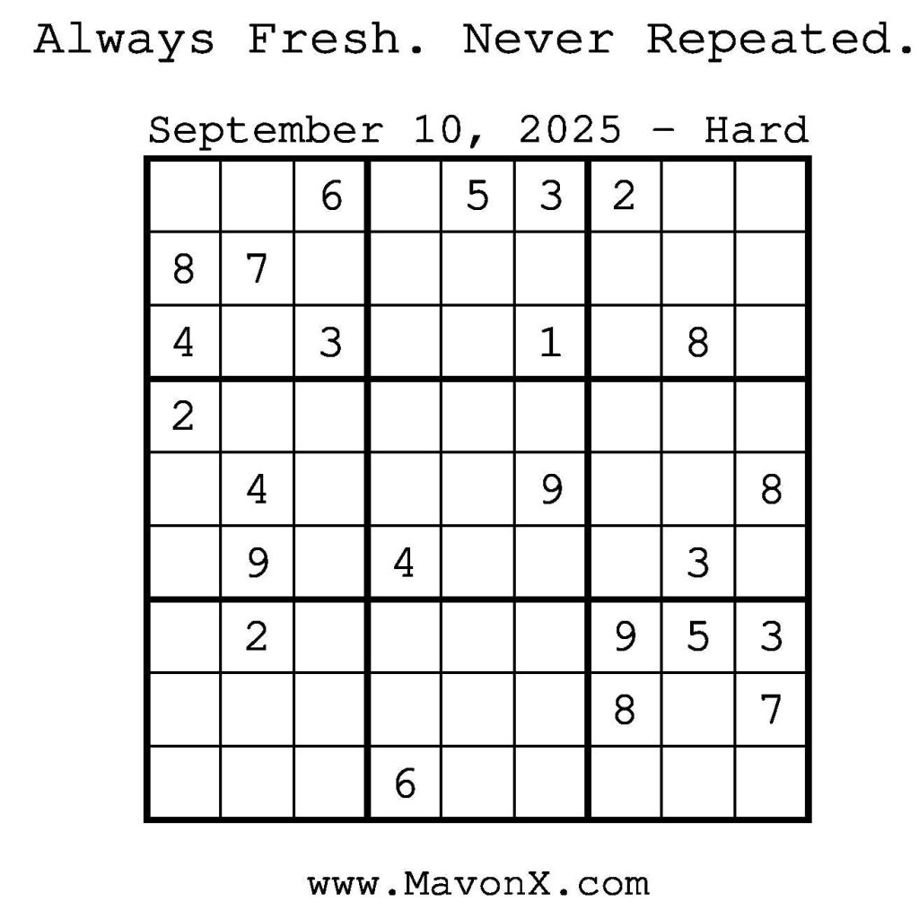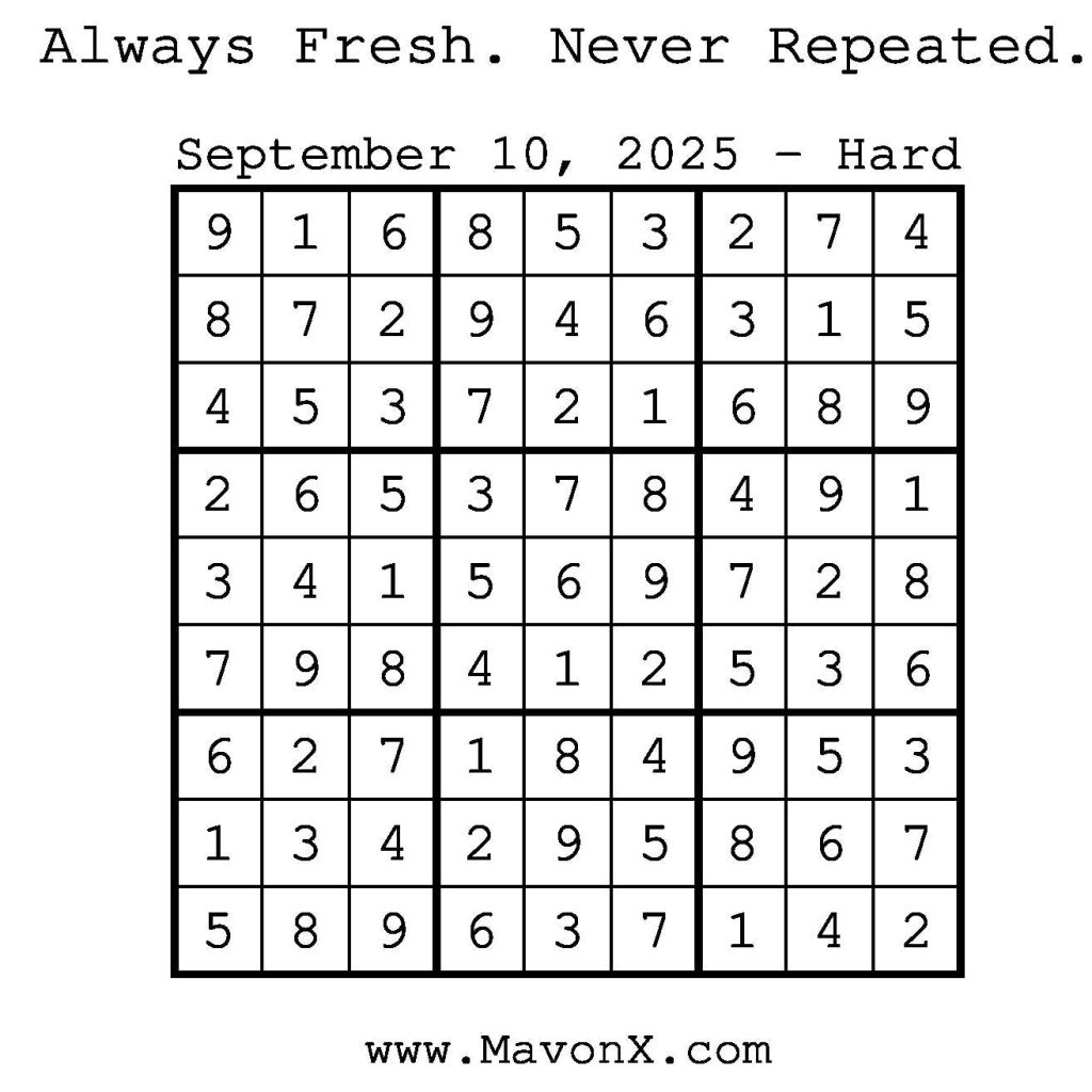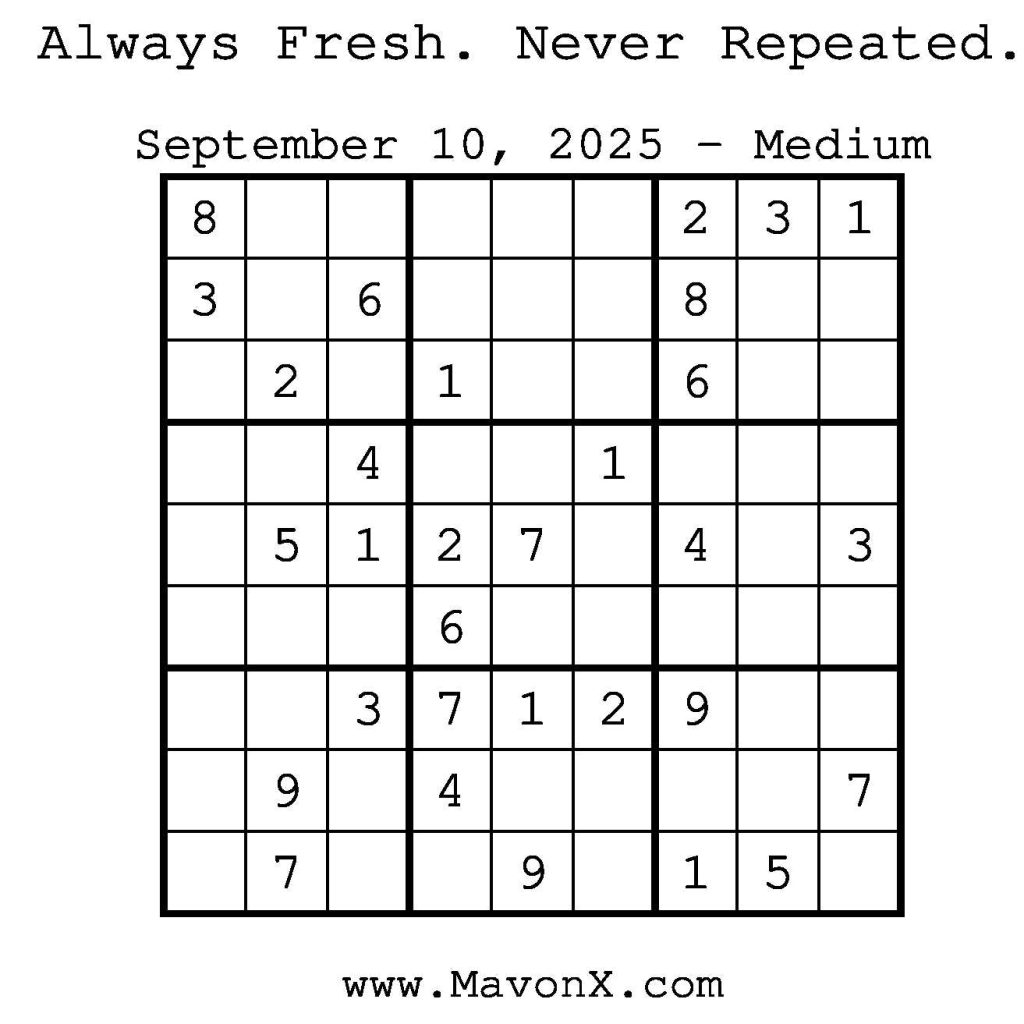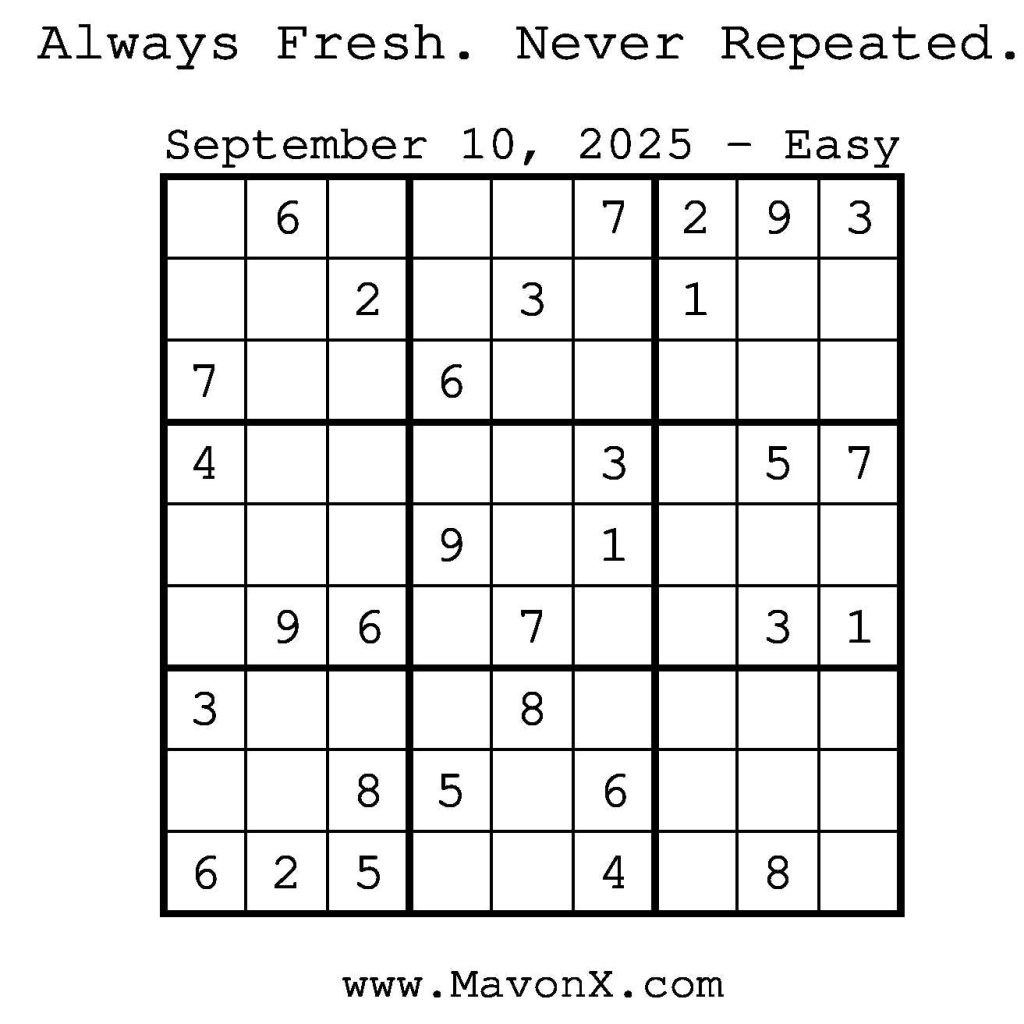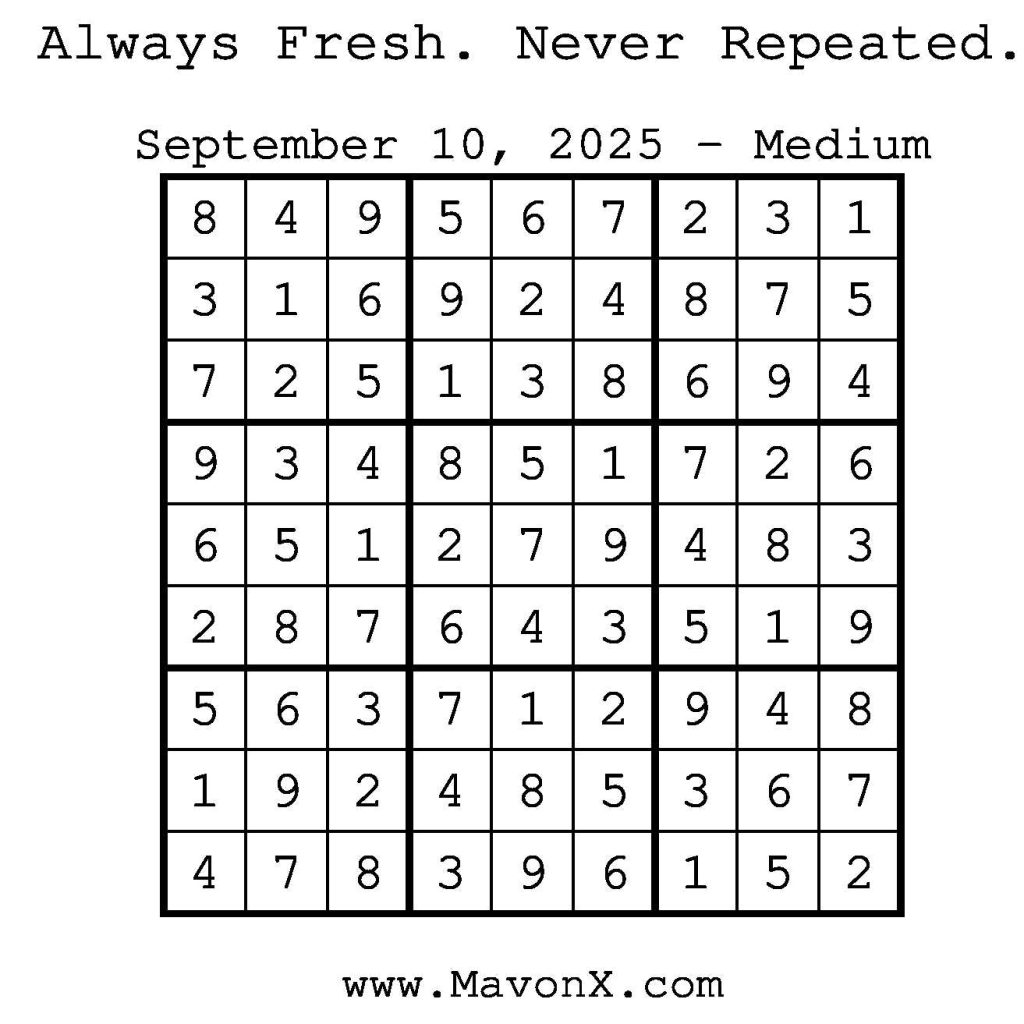 Puzzles of the Day – September 10, 2025 Post author:admin Post published:September 9, 2025 Post category:Free Stuff / Puzzle of the Day / Puzzle of the Day Solutions / Solutions Post comments:0 Comments Check out our books on Amazon! Check out our books on Barnes and Noble! Check out our books on Etsy! Easy Sudoku Coach Link Medium Sudoku Coach Link Hard Sudoku Coach Link Show Solution You Might Also Like Puzzles of the Day – June 14, 2025 June 16, 2025 Puzzles of the Day – December 16, 2025 December 16, 2025 Puzzles of the Day – March 27, 2026 March 27, 2026 Leave a Reply Cancel replyCommentEnter your name or username to comment Enter your email address to comment Enter your website URL (optional) Save my name, email, and website in this browser for the next time I comment.