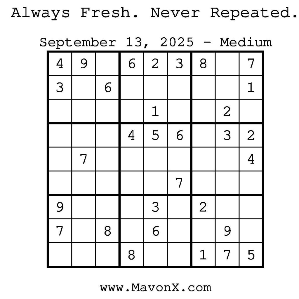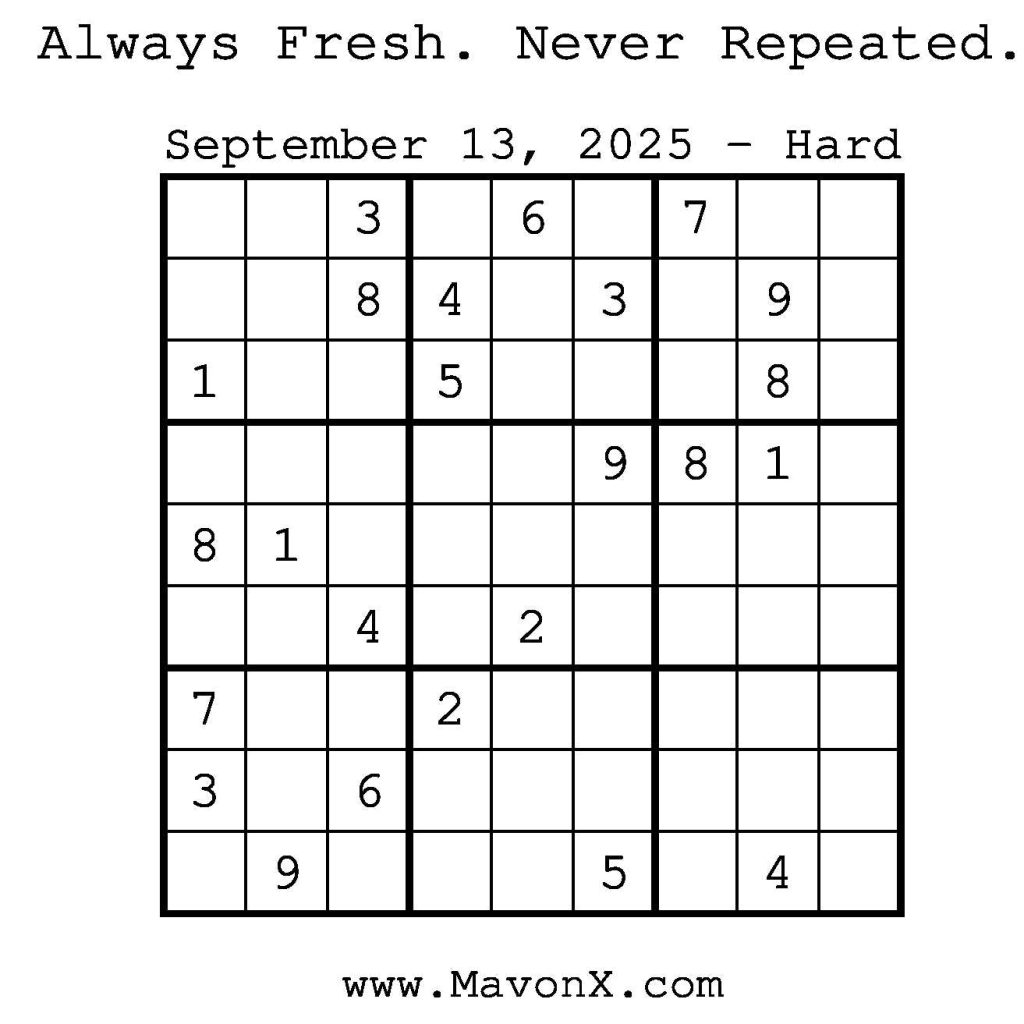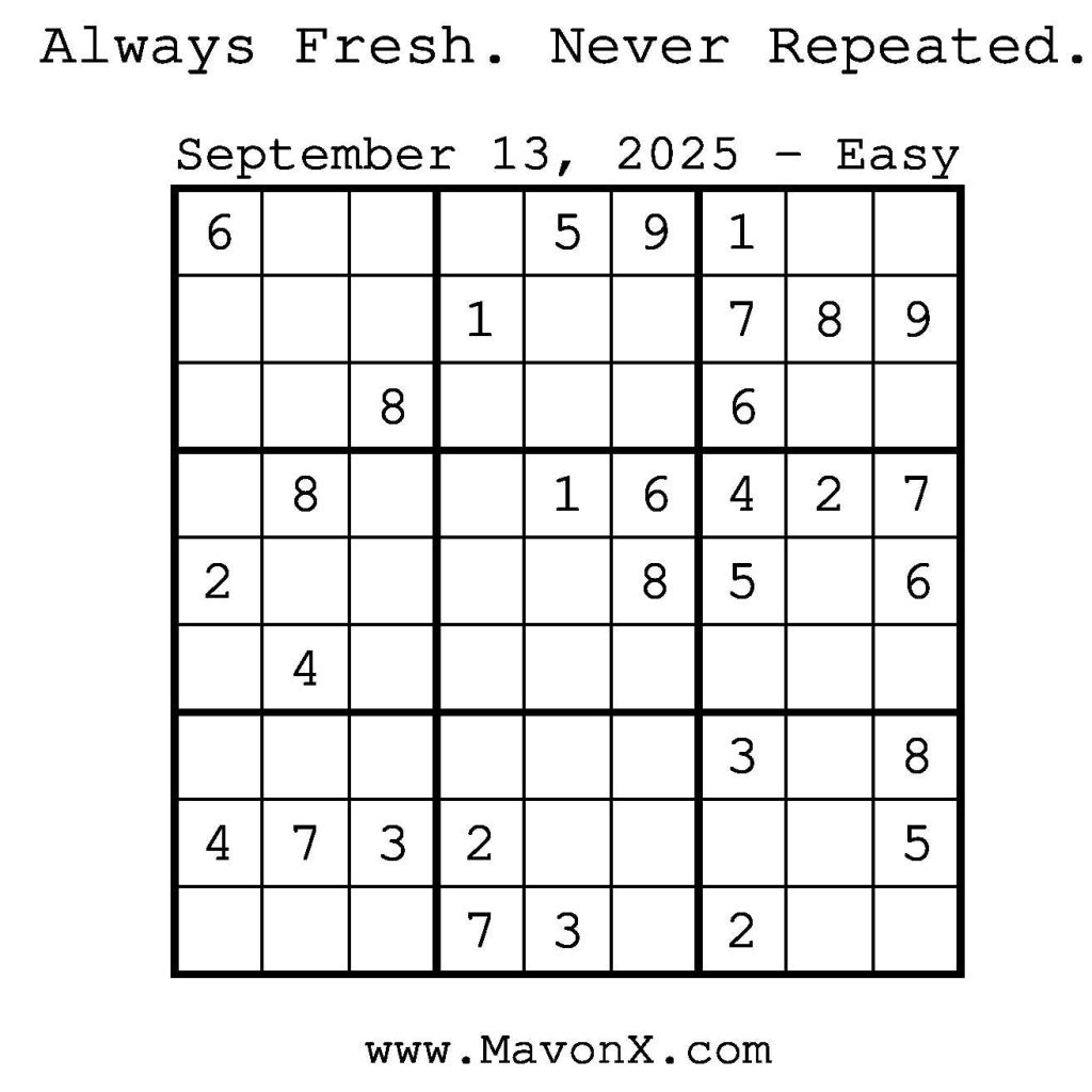 Puzzles of the Day – September 13, 2025 Post author:admin Post published:September 12, 2025 Post category:Free Stuff / Puzzle of the Day / Puzzle of the Day Solutions / Solutions Post comments:0 Comments Check out our books on Amazon! Check out our books on Barnes and Noble! Check out our books on Etsy! Easy Sudoku Coach Link Medium Sudoku Coach Link Hard Sudoku Coach Link Show Solution You Might Also Like Puzzles of the Day – July 28, 2025 July 28, 2025 Puzzles of the Day – February 9, 2026 February 9, 2026 Puzzles of the Day – August 31, 2024 August 31, 2024 Leave a Reply Cancel replyCommentEnter your name or username to comment Enter your email address to comment Enter your website URL (optional) Save my name, email, and website in this browser for the next time I comment.