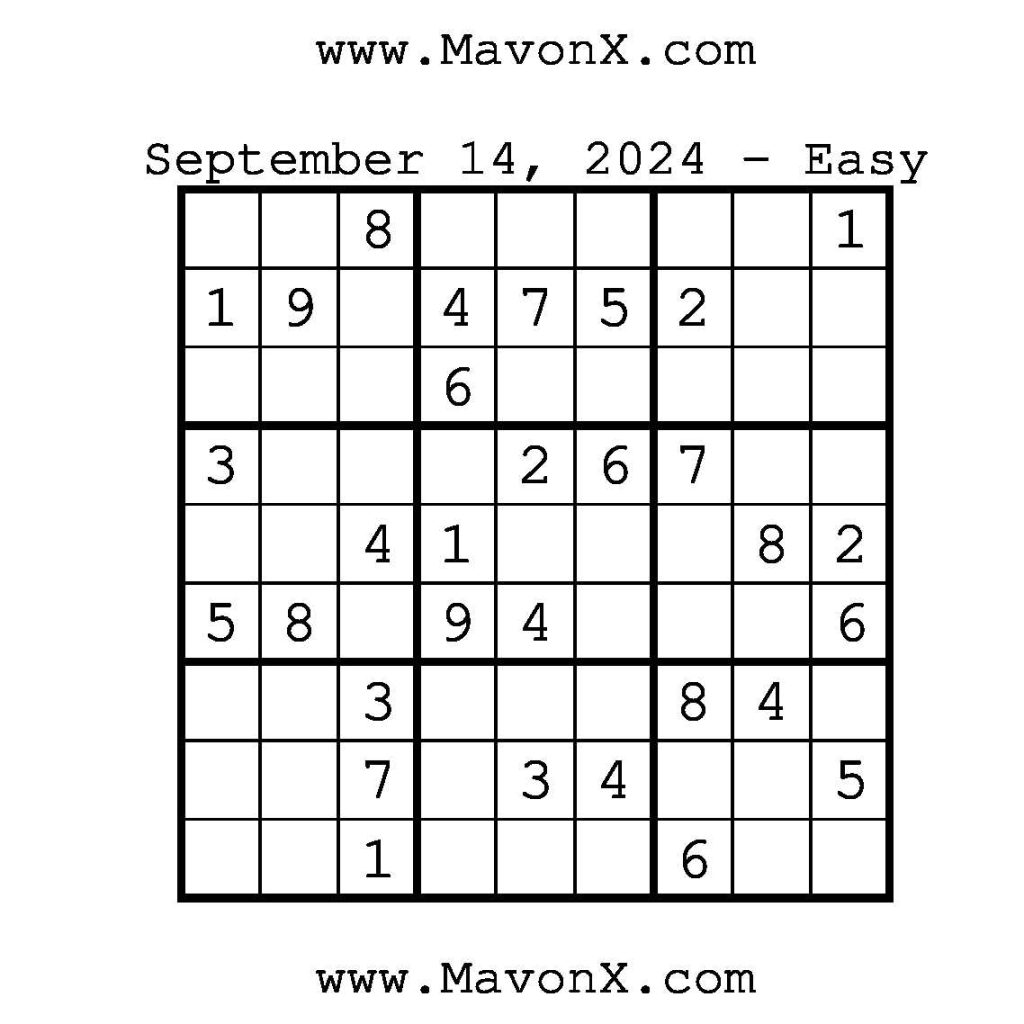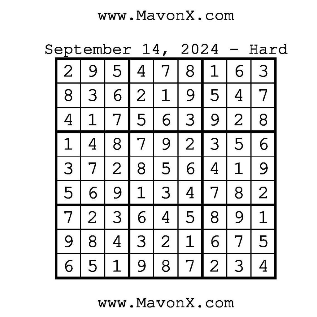 Puzzles of the Day – September 14, 2024 Post author:admin Post published:September 14, 2024 Post category:Free Stuff / Puzzle of the Day / Puzzle of the Day Solutions / Solutions Post comments:0 Comments Check out our books on Amazon!!!!! Easy Sudoku Coach Link Medium Sudoku Coach Link Hard Sudoku Coach Link Show Solution You Might Also Like Puzzles of the Day – February 14, 2025 February 14, 2025 Puzzles of the Day – April 17, 2025 April 16, 2025 Puzzles of the Day – November 9, 2024 November 8, 2024 Leave a Reply Cancel replyCommentEnter your name or username to comment Enter your email address to comment Enter your website URL (optional) Save my name, email, and website in this browser for the next time I comment.