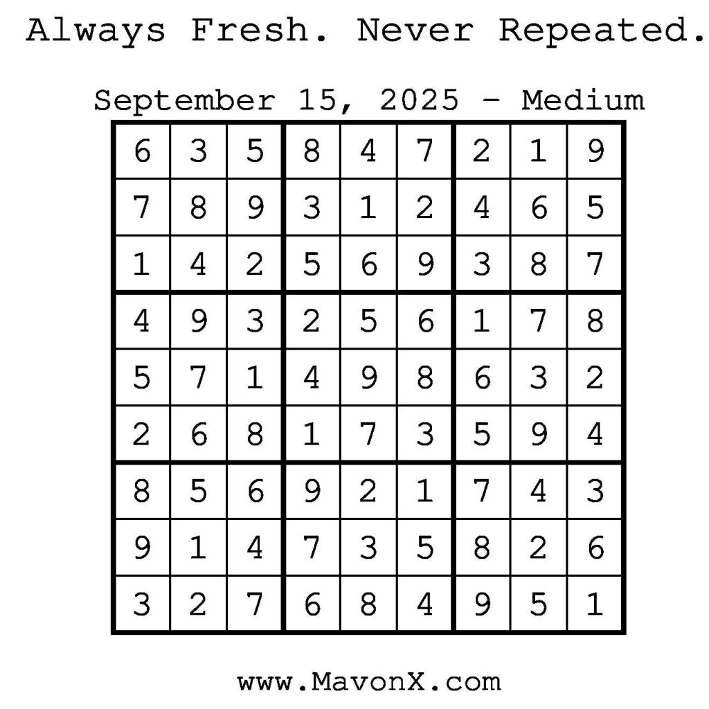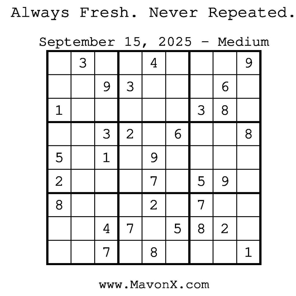 Puzzles of the Day – September 15, 2025 Post author:admin Post published:September 15, 2025 Post category:Free Stuff / Puzzle of the Day / Puzzle of the Day Solutions / Solutions Post comments:0 Comments Check out our books on Amazon! Check out our books on Barnes and Noble! Check out our books on Etsy! Easy Sudoku Coach Link Medium Sudoku Coach Link Hard Sudoku Coach Link Show Solution You Might Also Like Puzzles of the Day – September 28, 2024 September 28, 2024 Puzzles of the Day – December 11, 2024 December 10, 2024 Puzzles of the Day – April 21, 2025 April 21, 2025 Leave a Reply Cancel replyCommentEnter your name or username to comment Enter your email address to comment Enter your website URL (optional) Save my name, email, and website in this browser for the next time I comment.