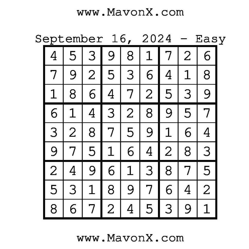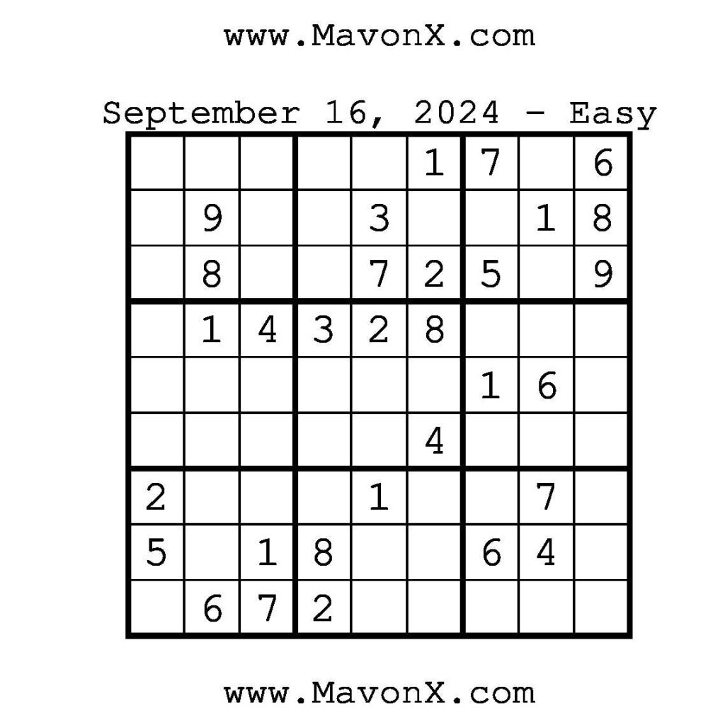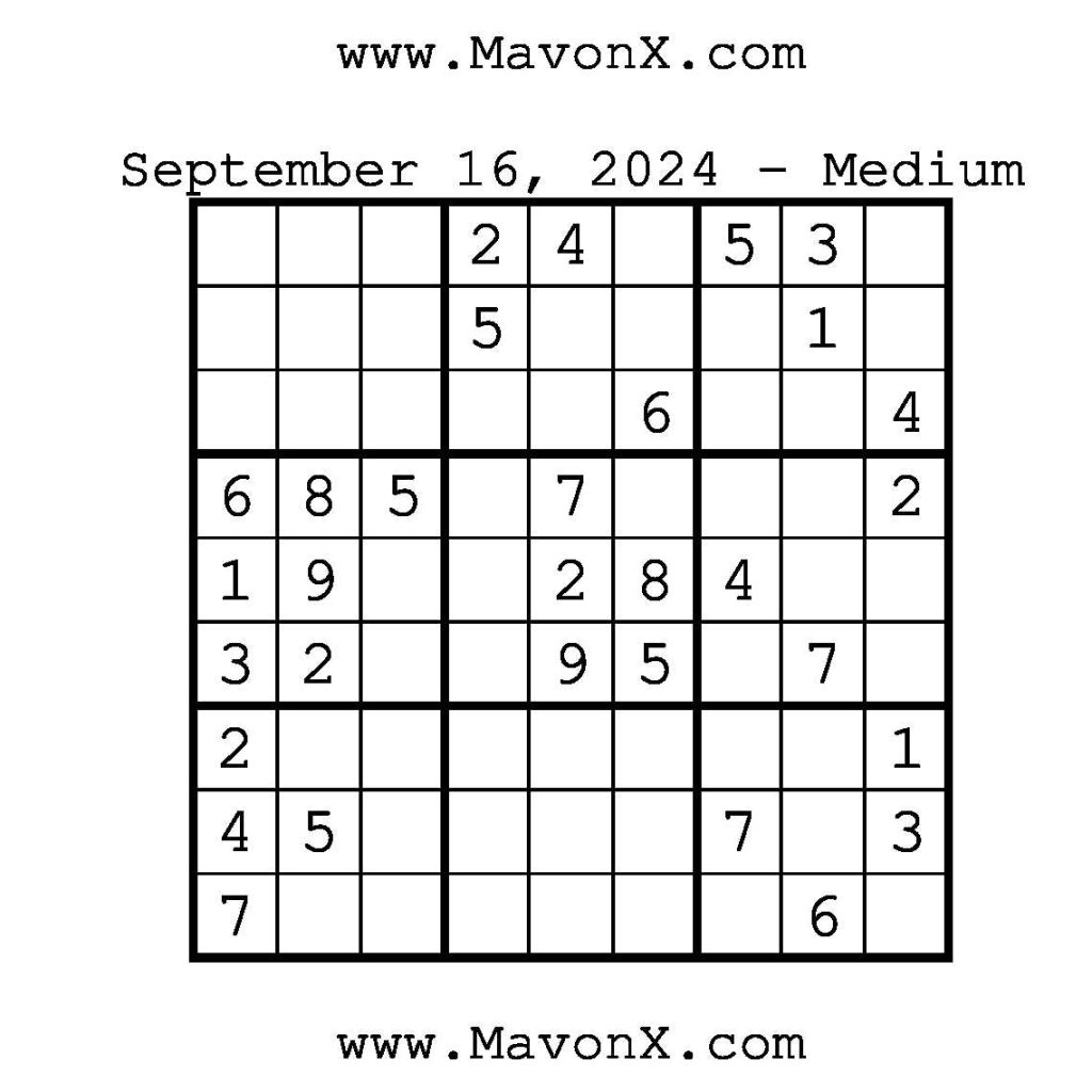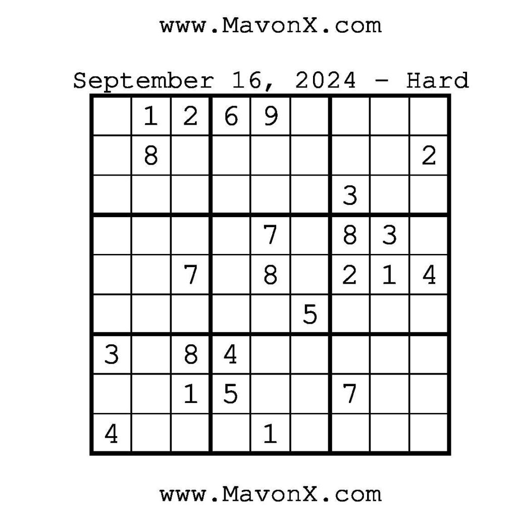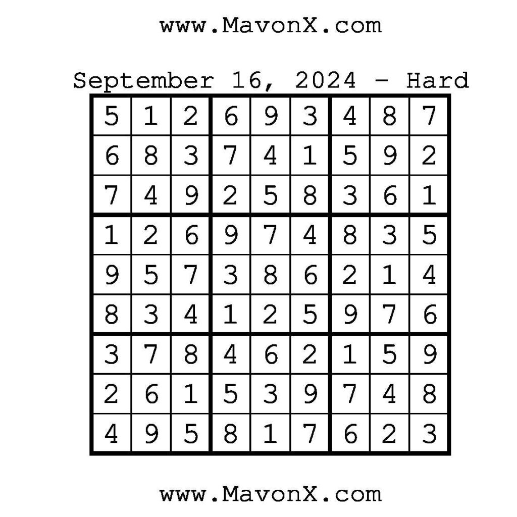 Puzzles of the Day – September 16, 2024 Post author:admin Post published:September 16, 2024 Post category:Free Stuff / Puzzle of the Day / Puzzle of the Day Solutions / Solutions Post comments:0 Comments Check out our books on Amazon!!!!! Easy Sudoku Coach Link Medium Sudoku Coach Link Hard Sudoku Coach Link Show Solution You Might Also Like Puzzles of the Day – November 8, 2025 November 7, 2025 Puzzles of the Day – February 12, 2025 February 13, 2025 Puzzle of the Day – July 21, 2024 July 21, 2024 Leave a Reply Cancel replyCommentEnter your name or username to comment Enter your email address to comment Enter your website URL (optional) Save my name, email, and website in this browser for the next time I comment.