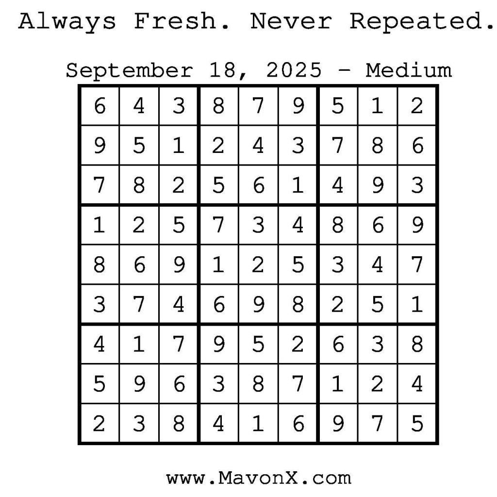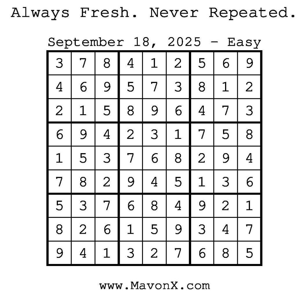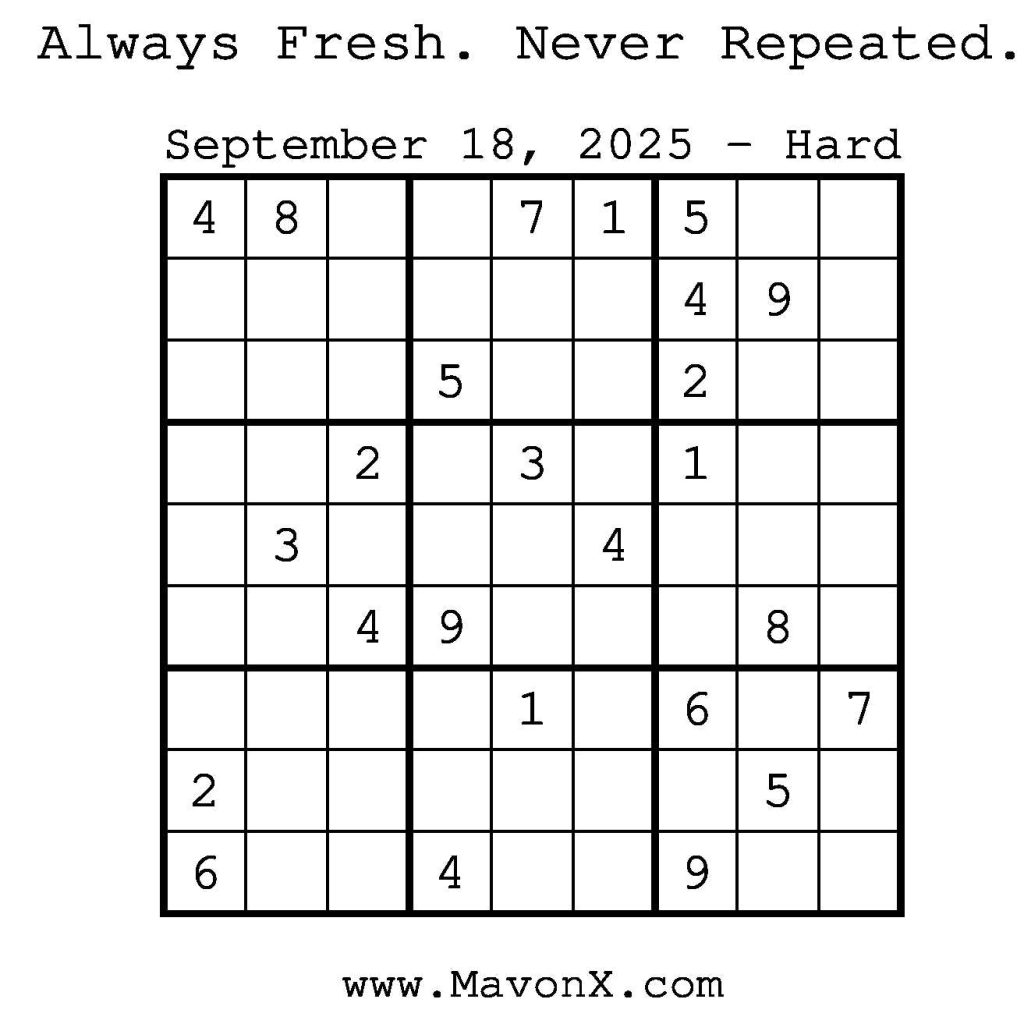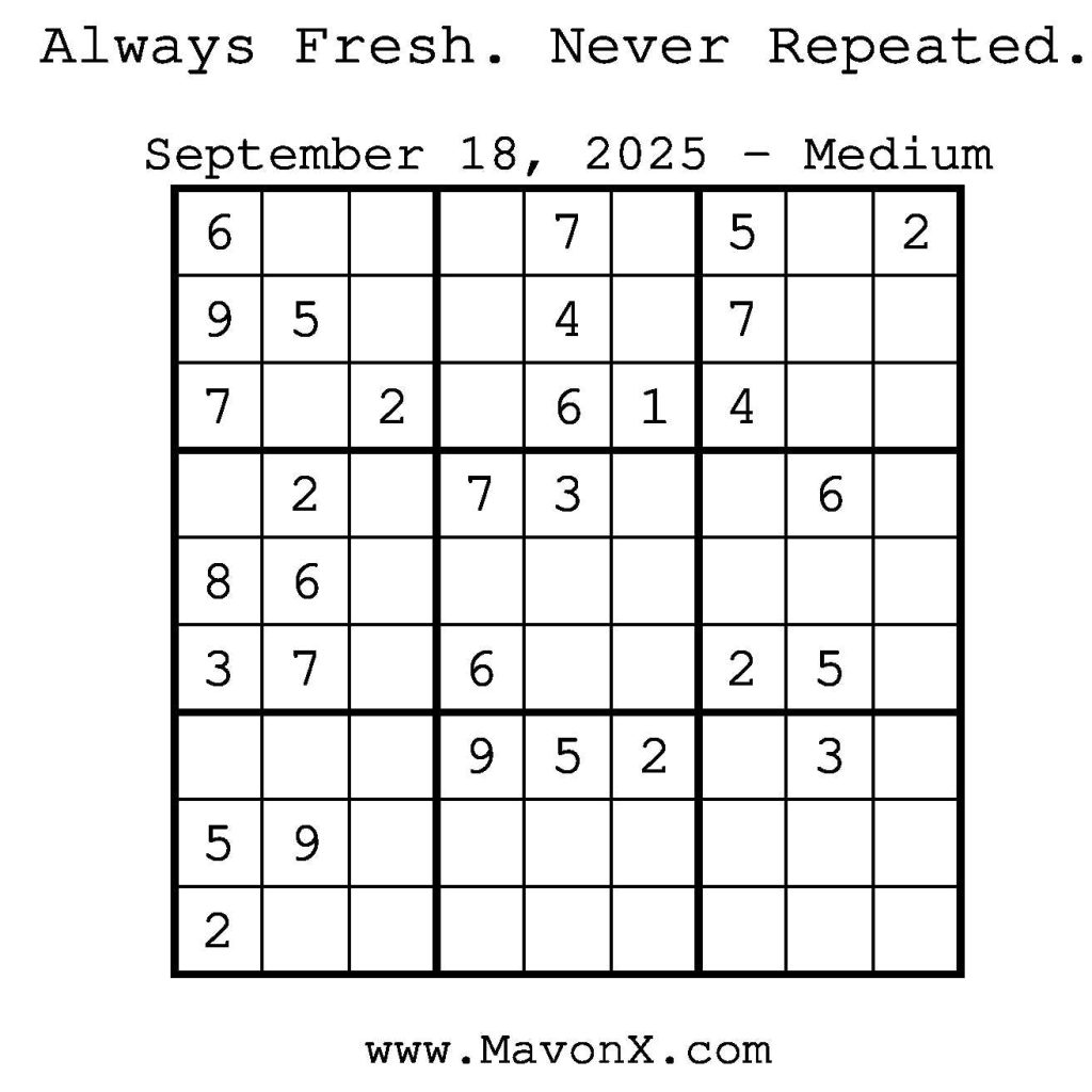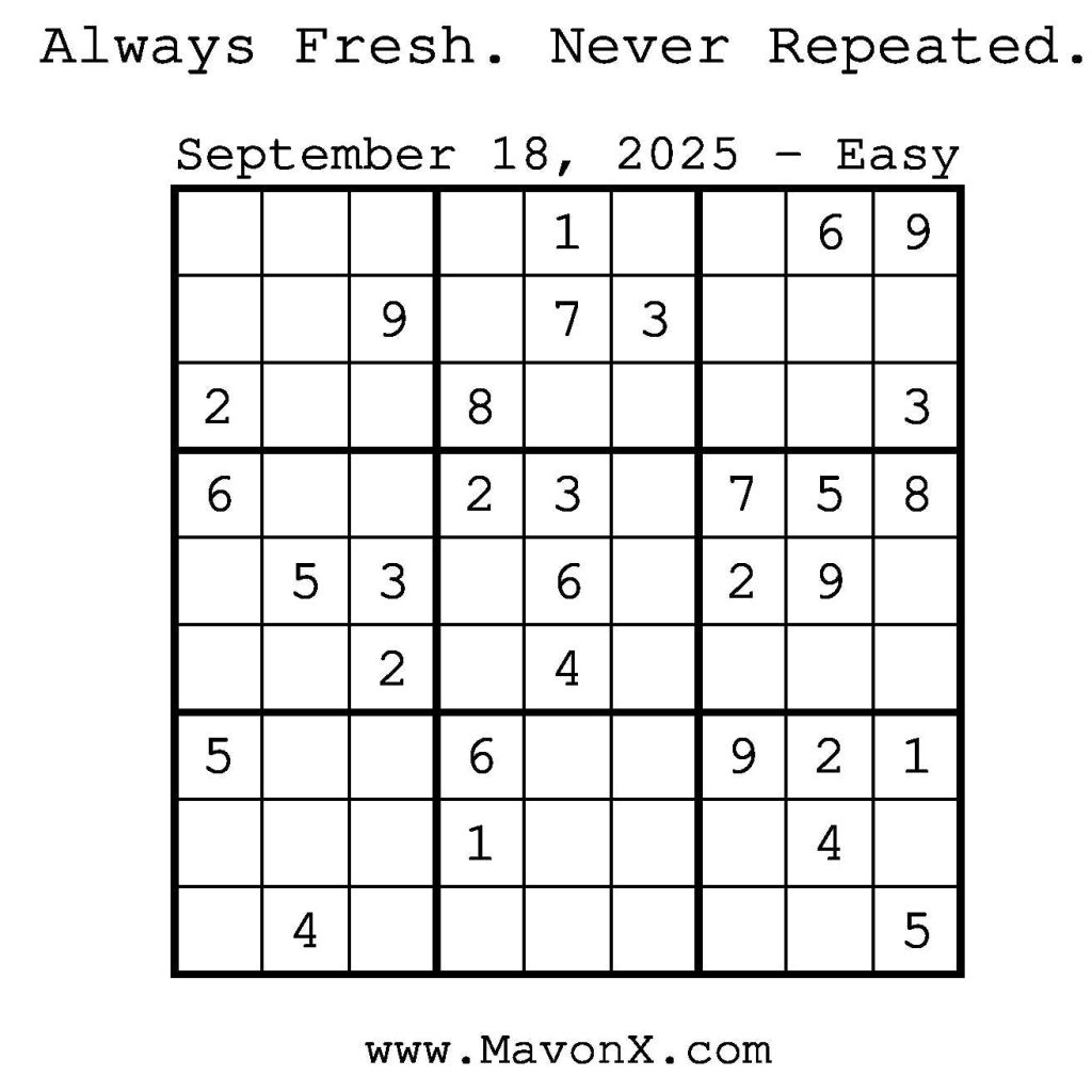 Puzzles of the Day – September 18, 2025 Post author:admin Post published:September 18, 2025 Post category:Free Stuff / Puzzle of the Day / Puzzle of the Day Solutions / Solutions Post comments:0 Comments Check out our books on Amazon! Check out our books on Barnes and Noble! Check out our books on Etsy! Easy Sudoku Coach Link Medium Sudoku Coach Link Hard Sudoku Coach Link Show Solution You Might Also Like Puzzles of the Day – December 02, 2025 December 2, 2025 Puzzles of the Day – August 23, 2024 August 23, 2024 Puzzles of the Day – February 4, 2026 February 3, 2026 Leave a Reply Cancel replyCommentEnter your name or username to comment Enter your email address to comment Enter your website URL (optional) Save my name, email, and website in this browser for the next time I comment.