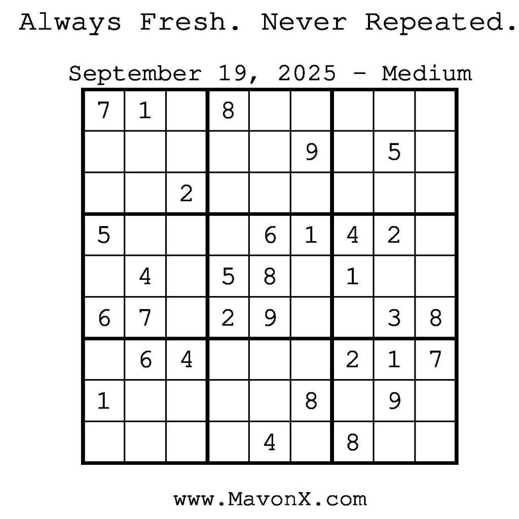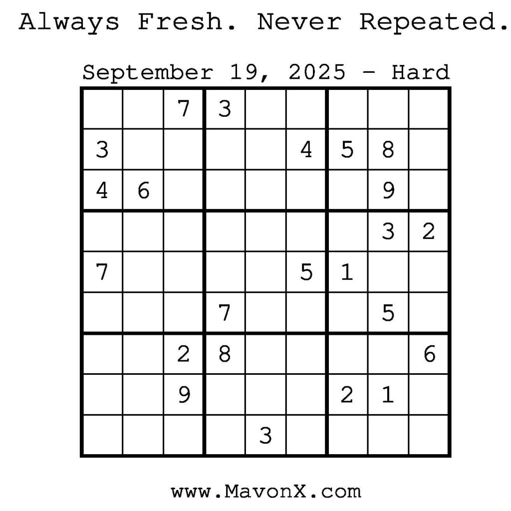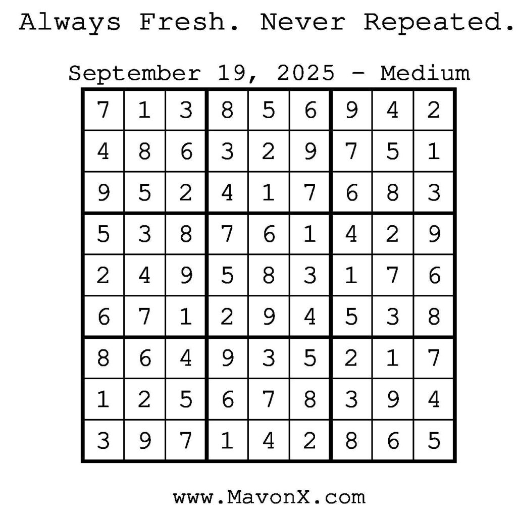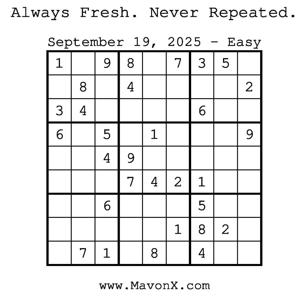 Puzzles of the Day – September 19, 2025 Post author:admin Post published:September 18, 2025 Post category:Free Stuff / Puzzle of the Day / Puzzle of the Day Solutions / Solutions Post comments:0 Comments Check out our books on Amazon! Check out our books on Barnes and Noble! Check out our books on Etsy! Easy Sudoku Coach Link Medium Sudoku Coach Link Hard Sudoku Coach Link Show Solution You Might Also Like Puzzles of the Day – June 6, 2025 June 5, 2025 Puzzles of the Day – May 22, 2025 May 22, 2025 Puzzles of the Day – December 29, 2025 December 29, 2025 Leave a Reply Cancel replyCommentEnter your name or username to comment Enter your email address to comment Enter your website URL (optional) Save my name, email, and website in this browser for the next time I comment.