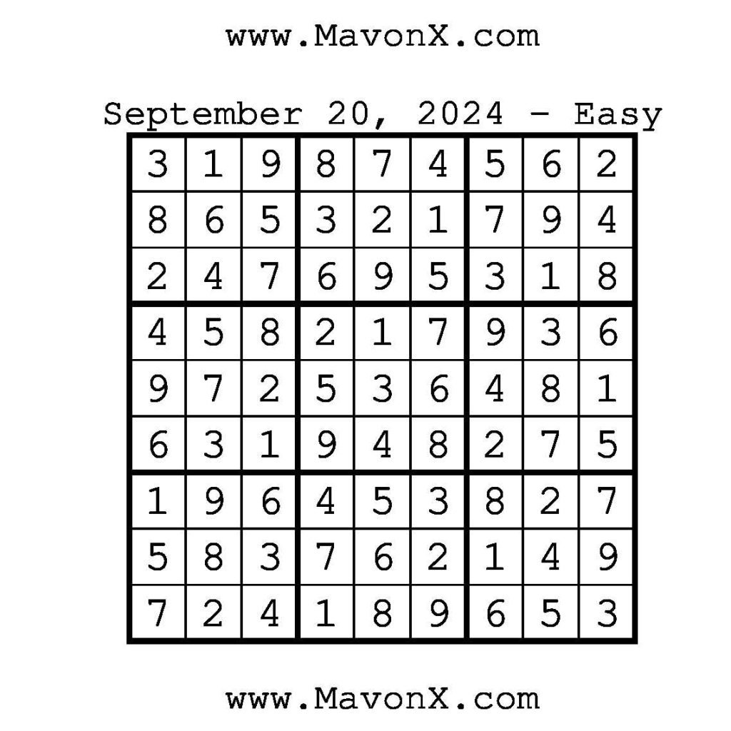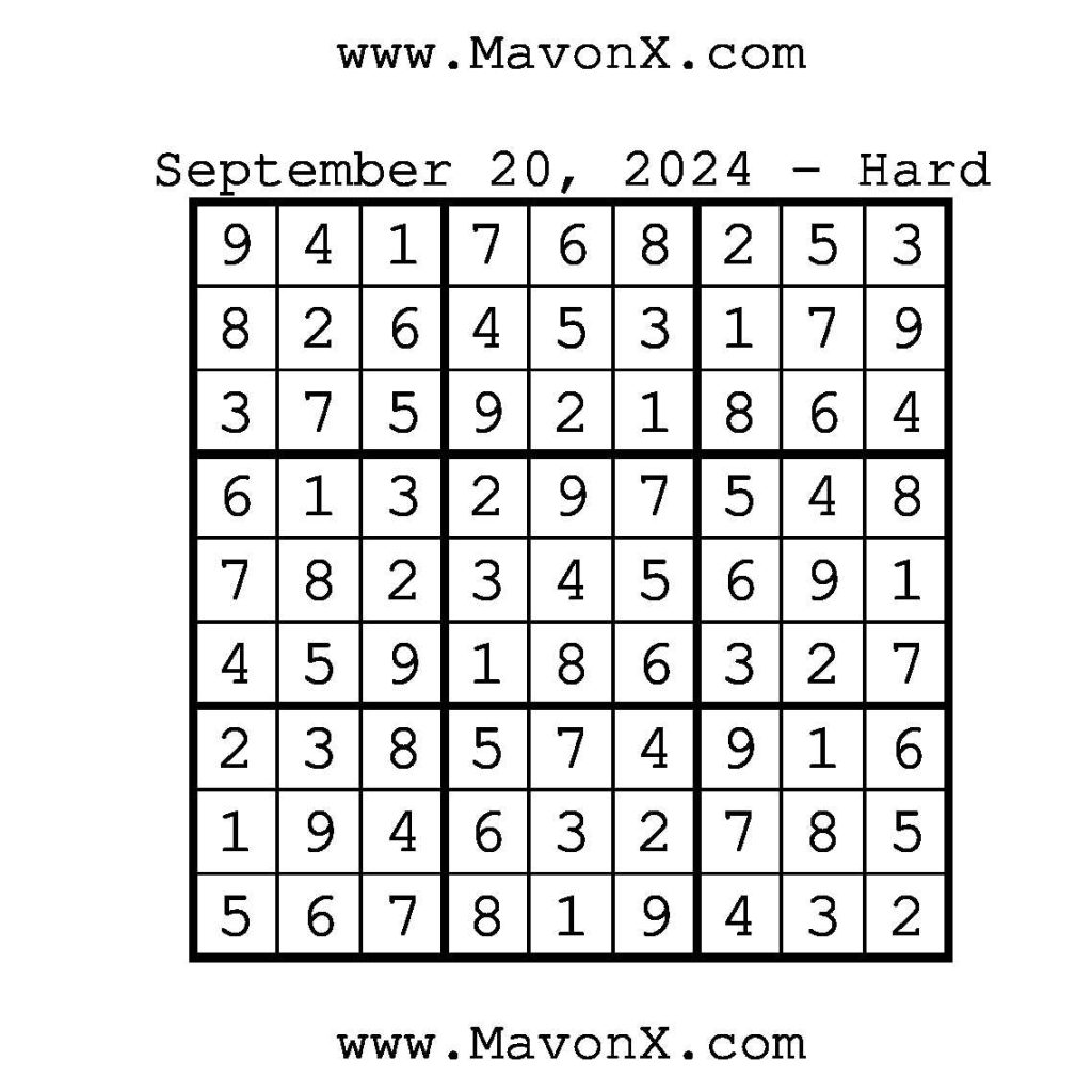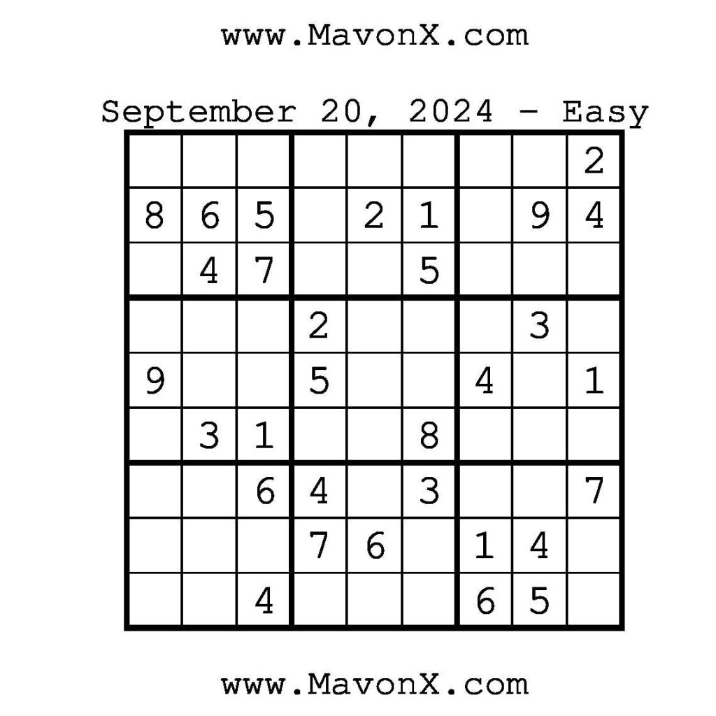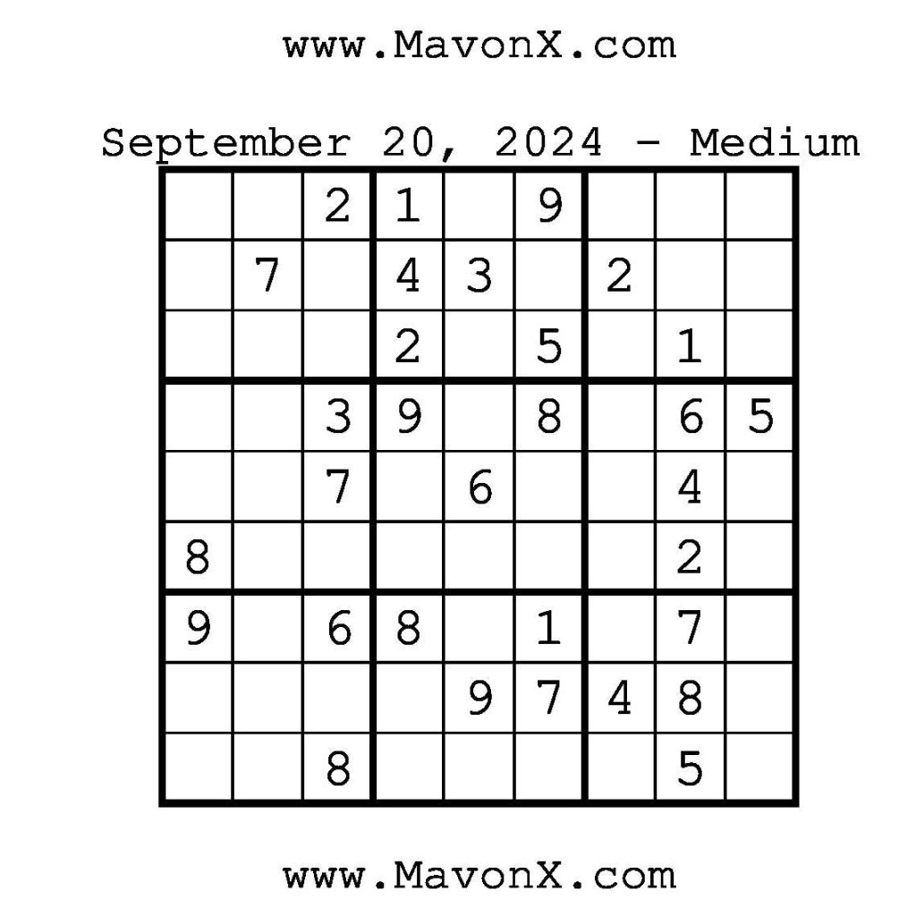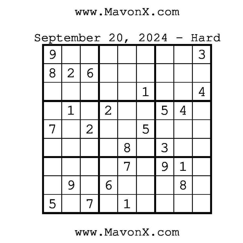Puzzles of the Day – September 20, 2024 Post author:admin Post published:September 20, 2024 Post category:Free Stuff / Puzzle of the Day / Puzzle of the Day Solutions / Solutions Post comments:0 Comments Check out our books on Amazon!!!!! Easy Sudoku Coach Link Medium Sudoku Coach Link Hard Sudoku Coach Link Show Solution You Might Also Like Puzzles of the Day – September 25, 2024 September 25, 2024 Puzzles of the Day – April 3, 2026 April 2, 2026 Puzzles of the Day – November 23, 2024 November 24, 2024 Leave a Reply Cancel replyCommentEnter your name or username to comment Enter your email address to comment Enter your website URL (optional) Save my name, email, and website in this browser for the next time I comment.