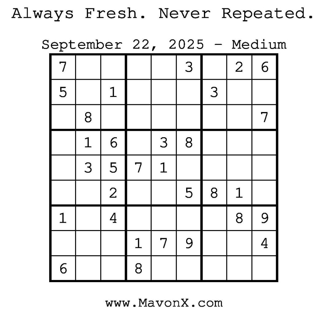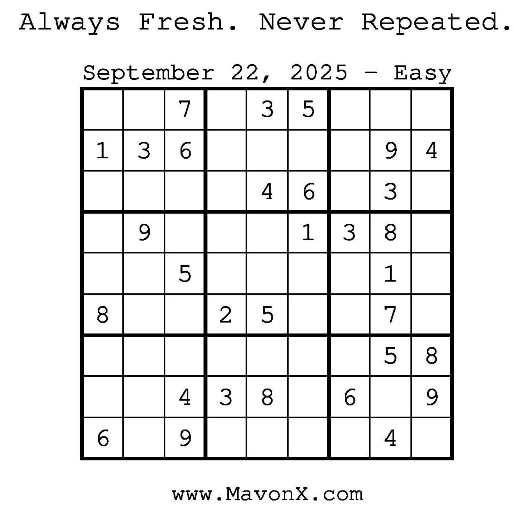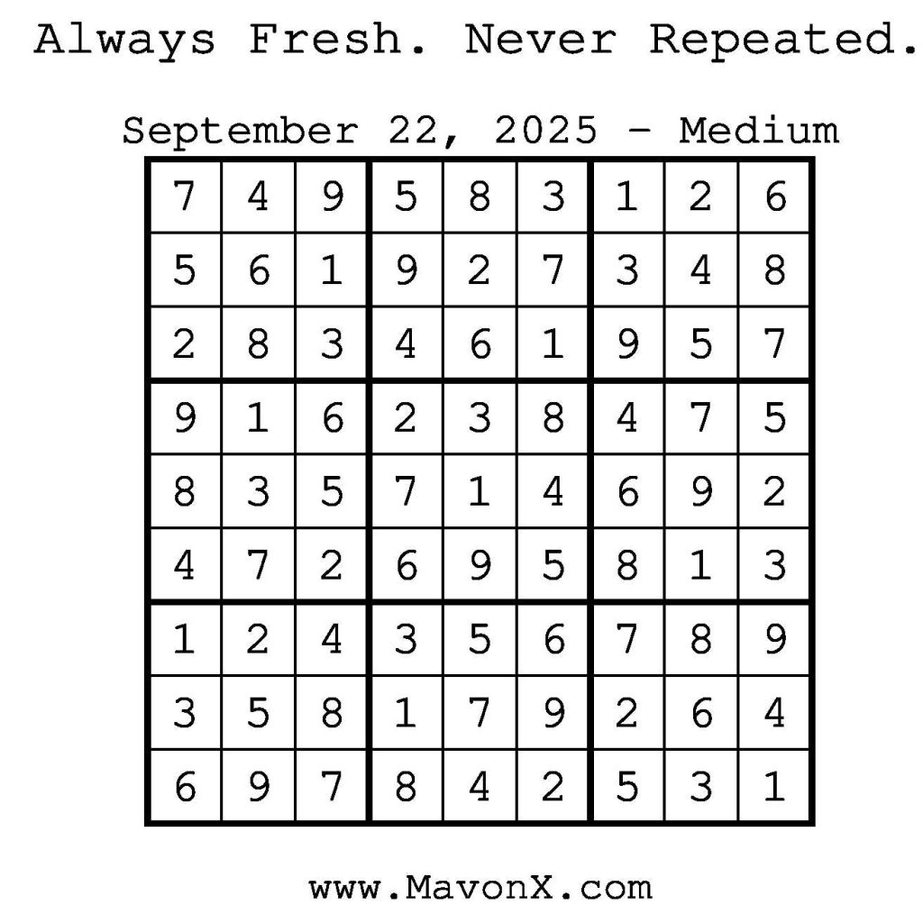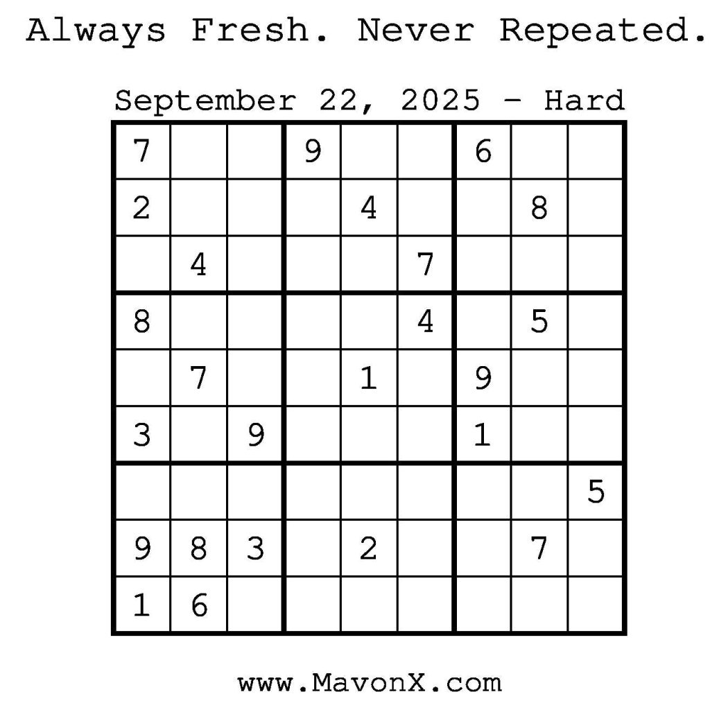 Puzzles of the Day – September 22, 2025 Post author:admin Post published:September 21, 2025 Post category:Free Stuff / Puzzle of the Day / Puzzle of the Day Solutions / Solutions Post comments:0 Comments Check out our books on Amazon! Check out our books on Barnes and Noble! Check out our books on Etsy! Easy Sudoku Coach Link Medium Sudoku Coach Link Hard Sudoku Coach Link Show Solution You Might Also Like Puzzles of the Day – April 13, 2025 April 12, 2025 Puzzles of the Day – December 18, 2025 December 18, 2025 Puzzles of the Day – April 10, 2026 April 10, 2026 Leave a Reply Cancel replyCommentEnter your name or username to comment Enter your email address to comment Enter your website URL (optional) Save my name, email, and website in this browser for the next time I comment.