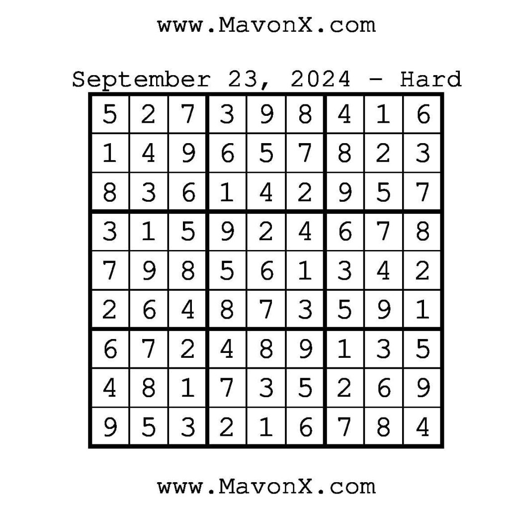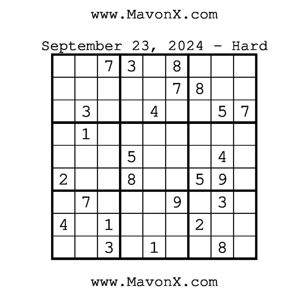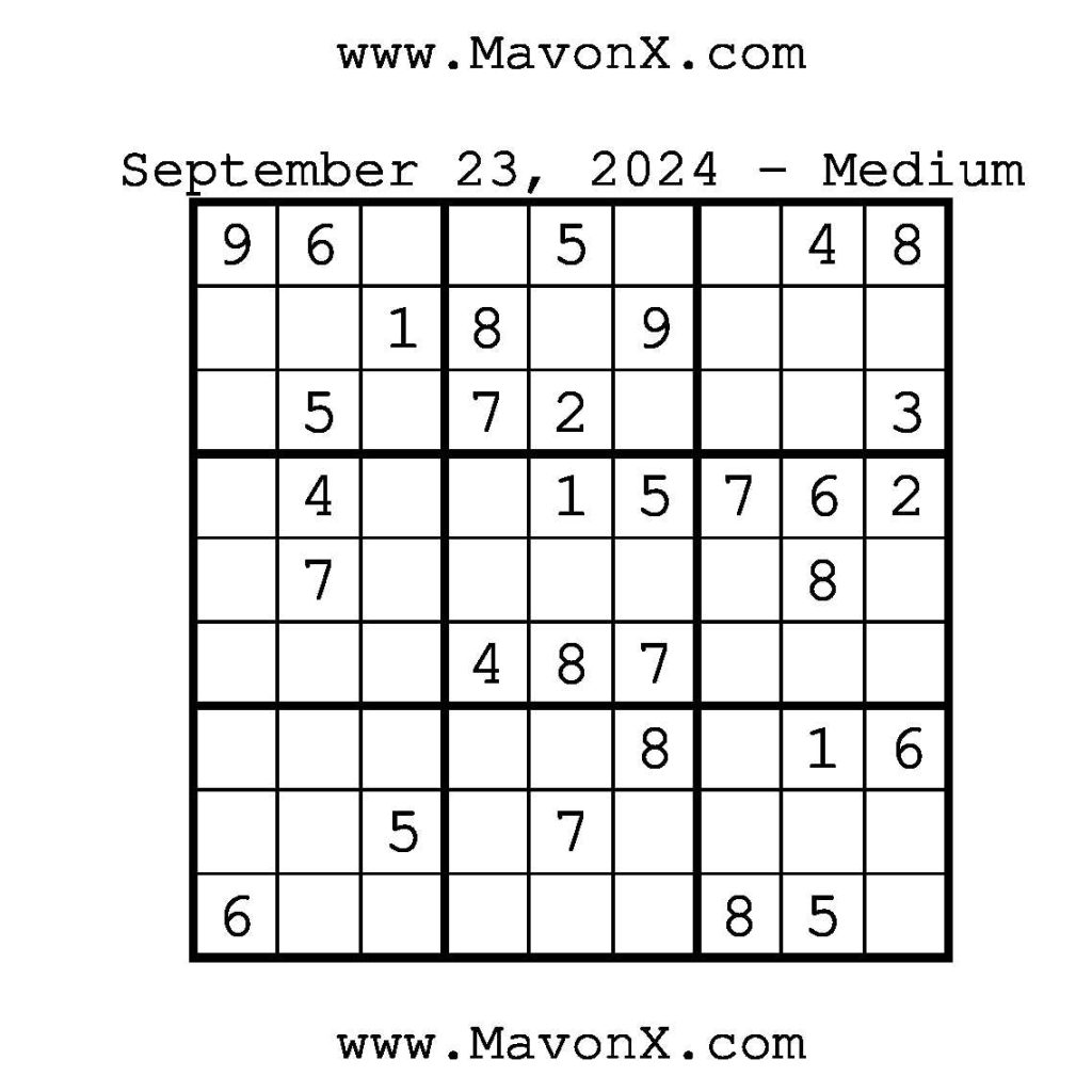Puzzles of the Day – September 23, 2024 Post author:admin Post published:September 23, 2024 Post category:Free Stuff / Puzzle of the Day / Puzzle of the Day Solutions / Solutions Post comments:0 Comments Check out our books on Amazon!!!!! Easy Sudoku Coach Link Medium Sudoku Coach Link Hard Sudoku Coach Link Show Solution You Might Also Like Puzzles of the Day – February 12, 2026 February 12, 2026 Puzzle of the Day – July 2, 2024 July 2, 2024 Puzzle of the Day – July 7, 2024 July 7, 2024 Leave a Reply Cancel replyCommentEnter your name or username to comment Enter your email address to comment Enter your website URL (optional) Save my name, email, and website in this browser for the next time I comment.