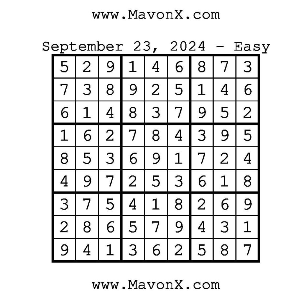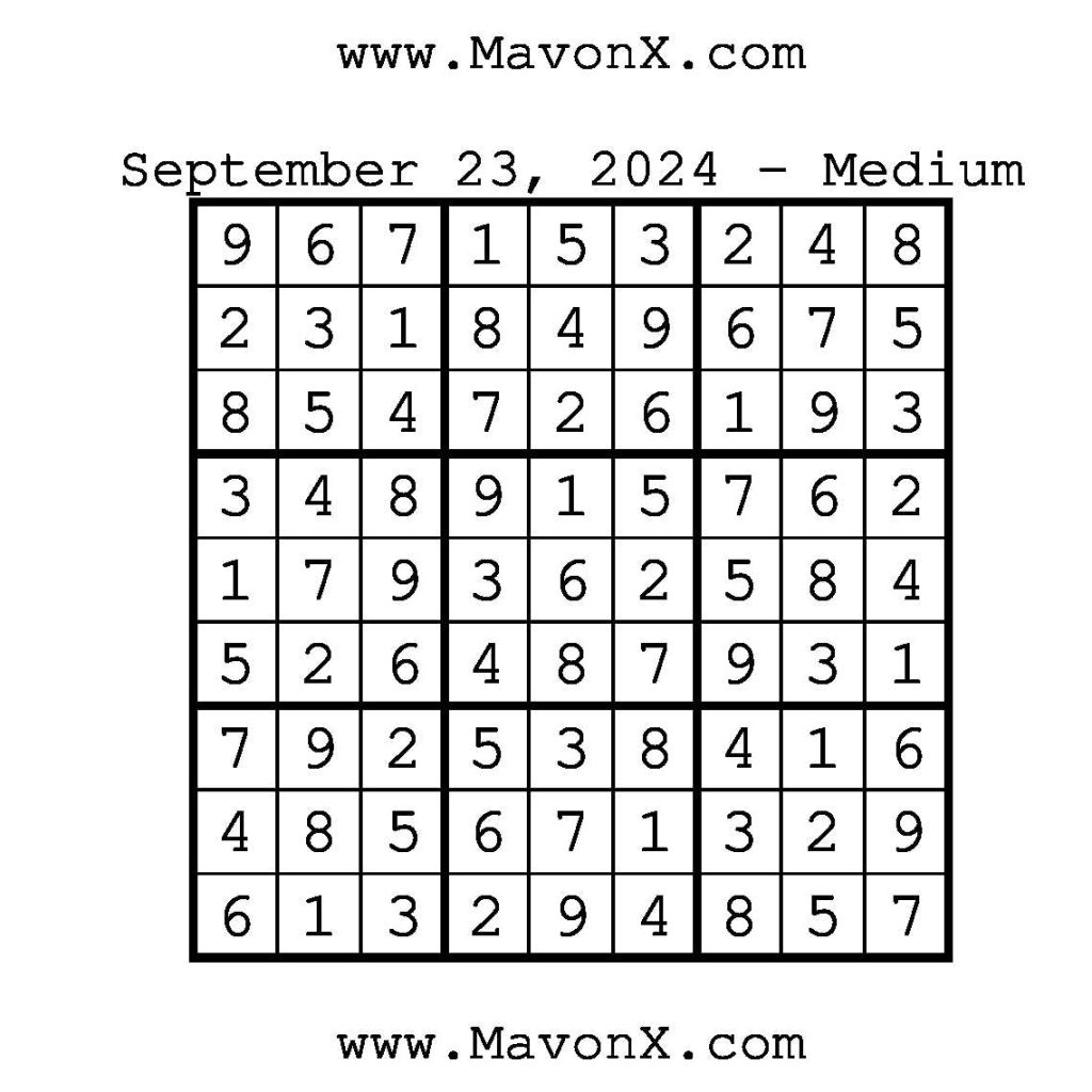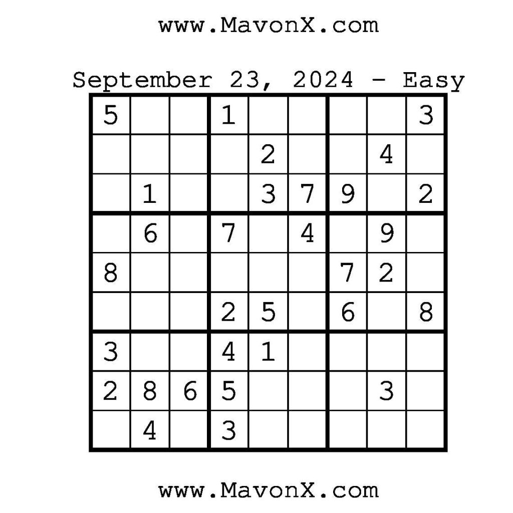 Puzzles of the Day – September 23, 2024 Post author:admin Post published:September 23, 2024 Post category:Free Stuff / Puzzle of the Day / Puzzle of the Day Solutions / Solutions Post comments:0 Comments Check out our books on Amazon!!!!! Easy Sudoku Coach Link Medium Sudoku Coach Link Hard Sudoku Coach Link Show Solution You Might Also Like Puzzles of the Day – February 12, 2026 February 12, 2026 Puzzle of the Day – July 2, 2024 July 2, 2024 Puzzle of the Day – July 7, 2024 July 7, 2024 Leave a Reply Cancel replyCommentEnter your name or username to comment Enter your email address to comment Enter your website URL (optional) Save my name, email, and website in this browser for the next time I comment.