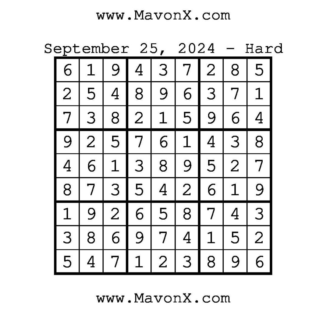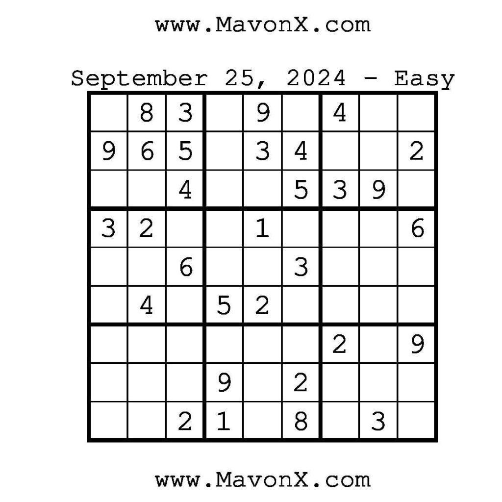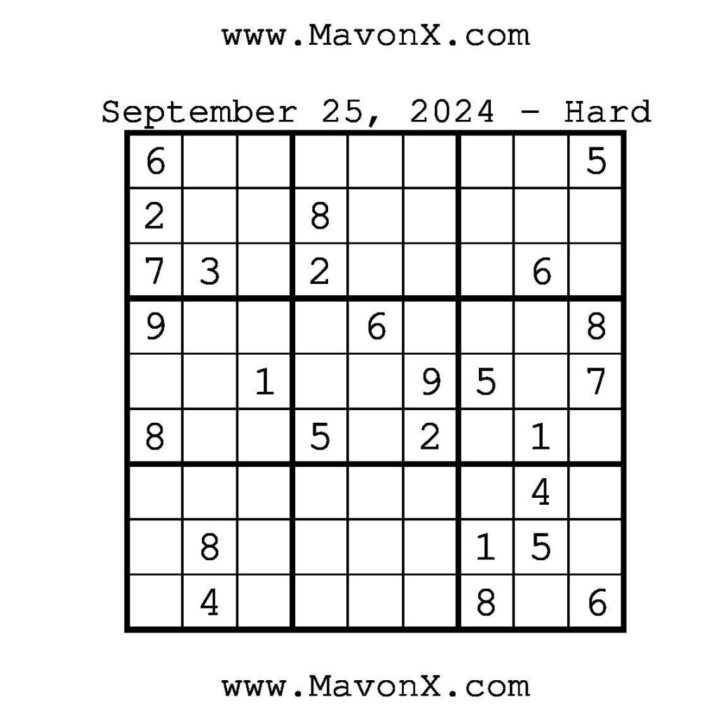 Puzzles of the Day – September 25, 2024 Post author:admin Post published:September 25, 2024 Post category:Free Stuff / Puzzle of the Day / Puzzle of the Day Solutions / Solutions Post comments:0 Comments Check out our books on Amazon!!!!! Easy Sudoku Coach Link Medium Sudoku Coach Link Hard Sudoku Coach Link Show Solution You Might Also Like Puzzles of the Day – March 22, 2025 March 22, 2025 Puzzles of the Day – February 27, 2026 February 26, 2026 Puzzles of the Day – September 24, 2024 September 24, 2024 Leave a Reply Cancel replyCommentEnter your name or username to comment Enter your email address to comment Enter your website URL (optional) Save my name, email, and website in this browser for the next time I comment.