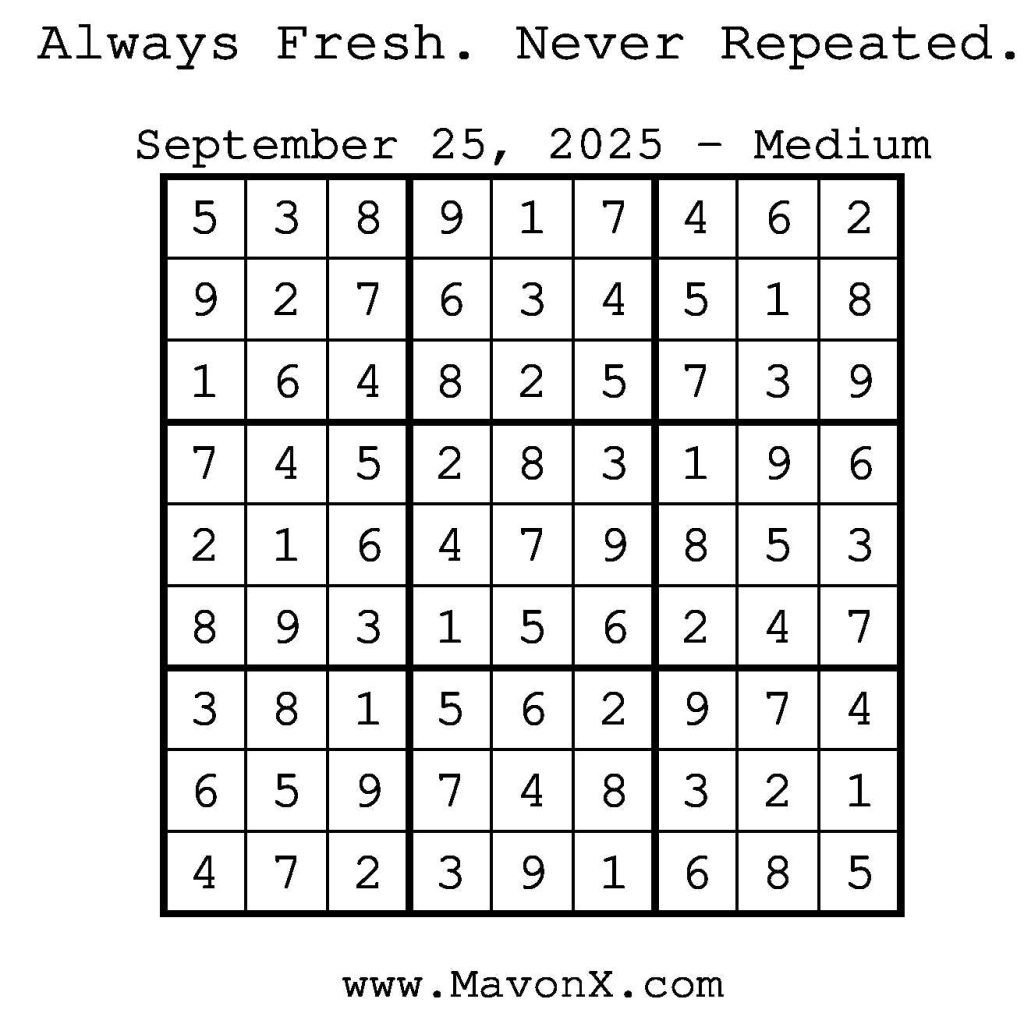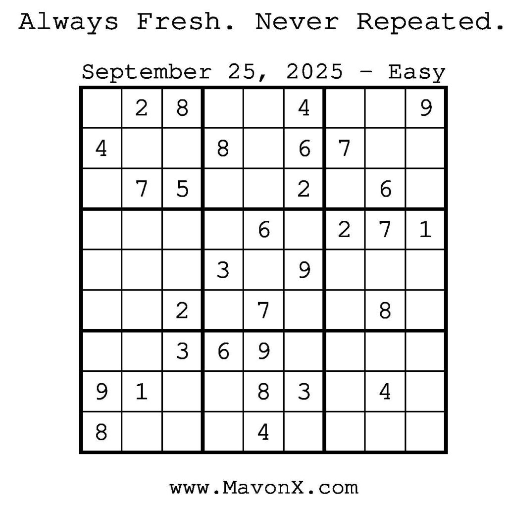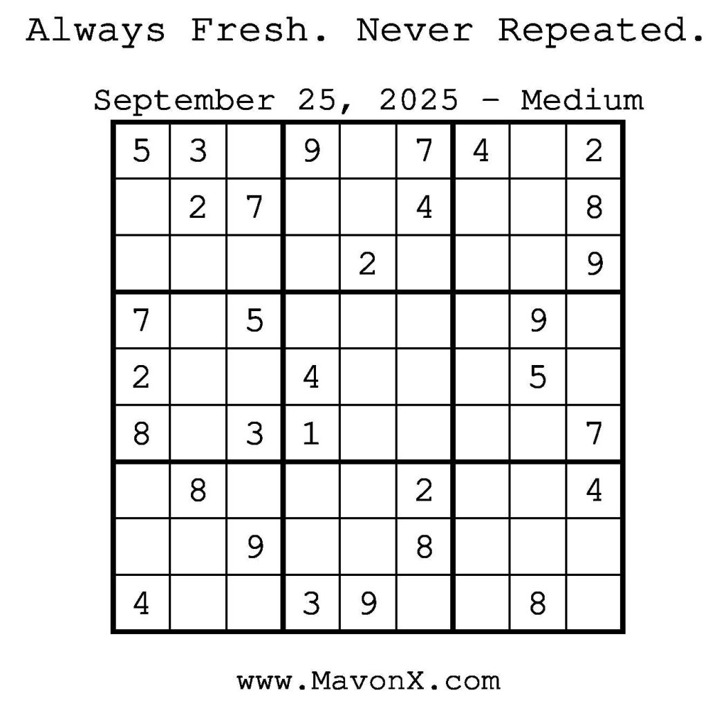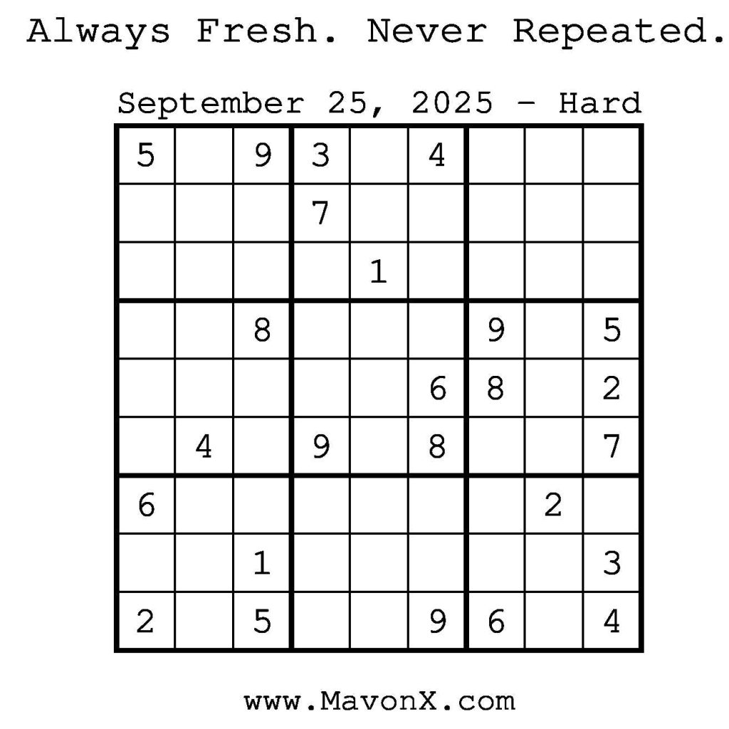 Puzzles of the Day – September 25, 2025 Post author:admin Post published:September 25, 2025 Post category:Free Stuff / Puzzle of the Day / Puzzle of the Day Solutions / Solutions Post comments:0 Comments Check out our books on Amazon! Check out our books on Barnes and Noble! Check out our books on Etsy! Easy Sudoku Coach Link Medium Sudoku Coach Link Hard Sudoku Coach Link Show Solution You Might Also Like Puzzles of the Day – March 31, 2026 March 29, 2026 Puzzles of the Day – October 21, 2025 October 20, 2025 Puzzles of the Day – August 13, 2024 August 13, 2024 Leave a Reply Cancel replyCommentEnter your name or username to comment Enter your email address to comment Enter your website URL (optional) Save my name, email, and website in this browser for the next time I comment.