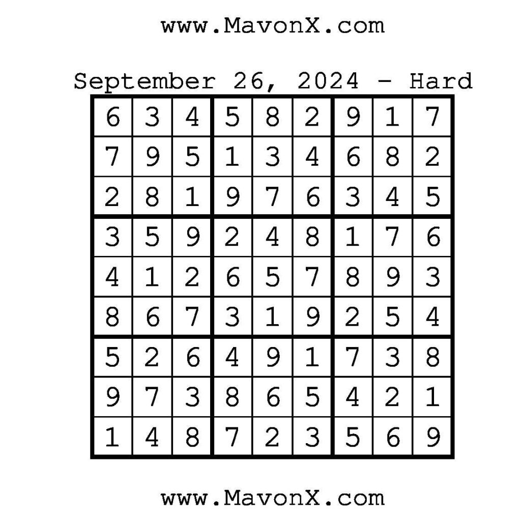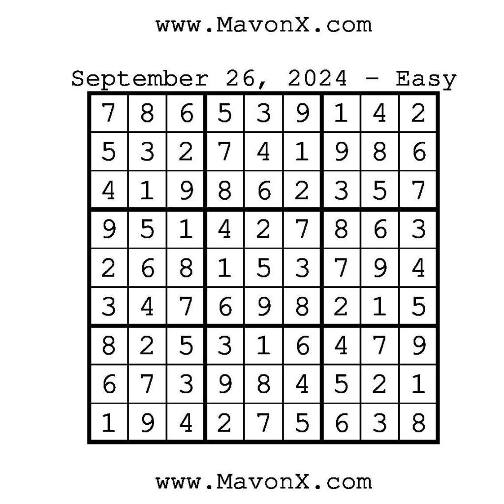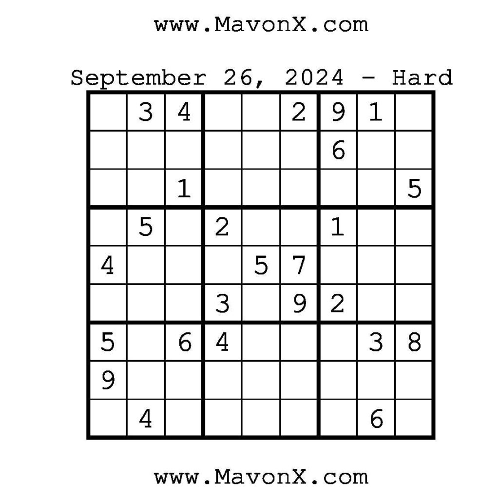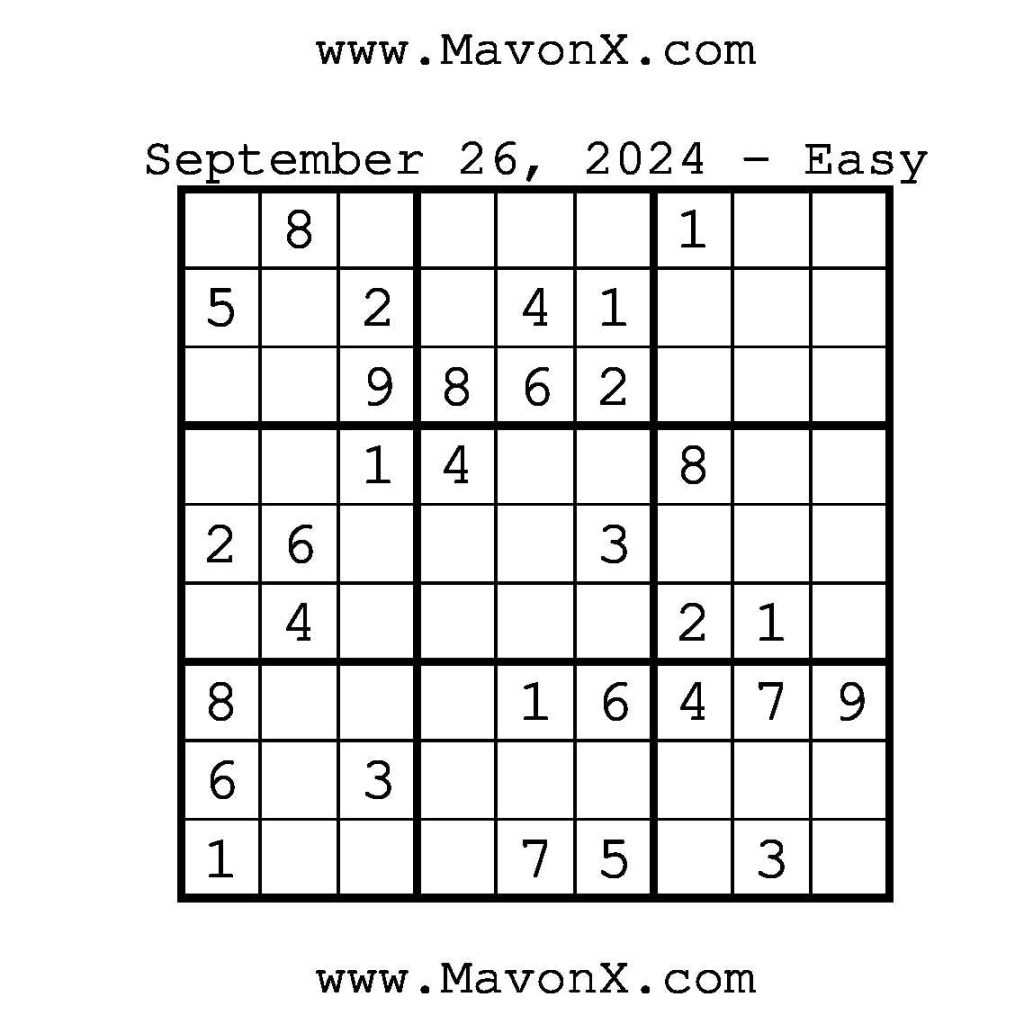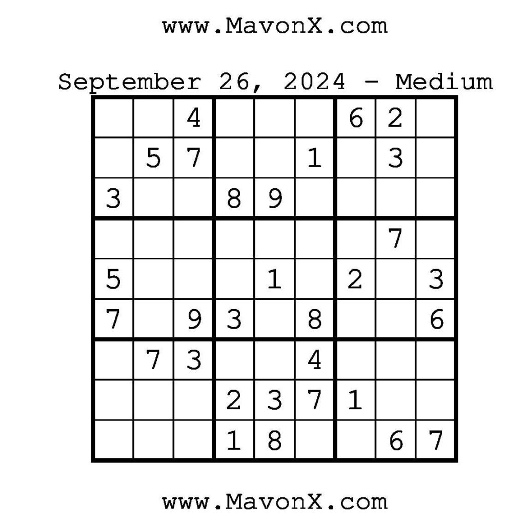 Puzzles of the Day – September 26, 2024 Post author:admin Post published:September 26, 2024 Post category:Free Stuff / Puzzle of the Day / Puzzle of the Day Solutions / Solutions Post comments:0 Comments Check out our books on Amazon!!!!! Easy Sudoku Coach Link Medium Sudoku Coach Link Hard Sudoku Coach Link Show Solution You Might Also Like Puzzles of the Day – February 25, 2026 February 25, 2026 Puzzle of the Day – August 6, 2024 August 6, 2024 Puzzles of the Day – September 10, 2024 September 10, 2024 Leave a Reply Cancel replyCommentEnter your name or username to comment Enter your email address to comment Enter your website URL (optional) Save my name, email, and website in this browser for the next time I comment.