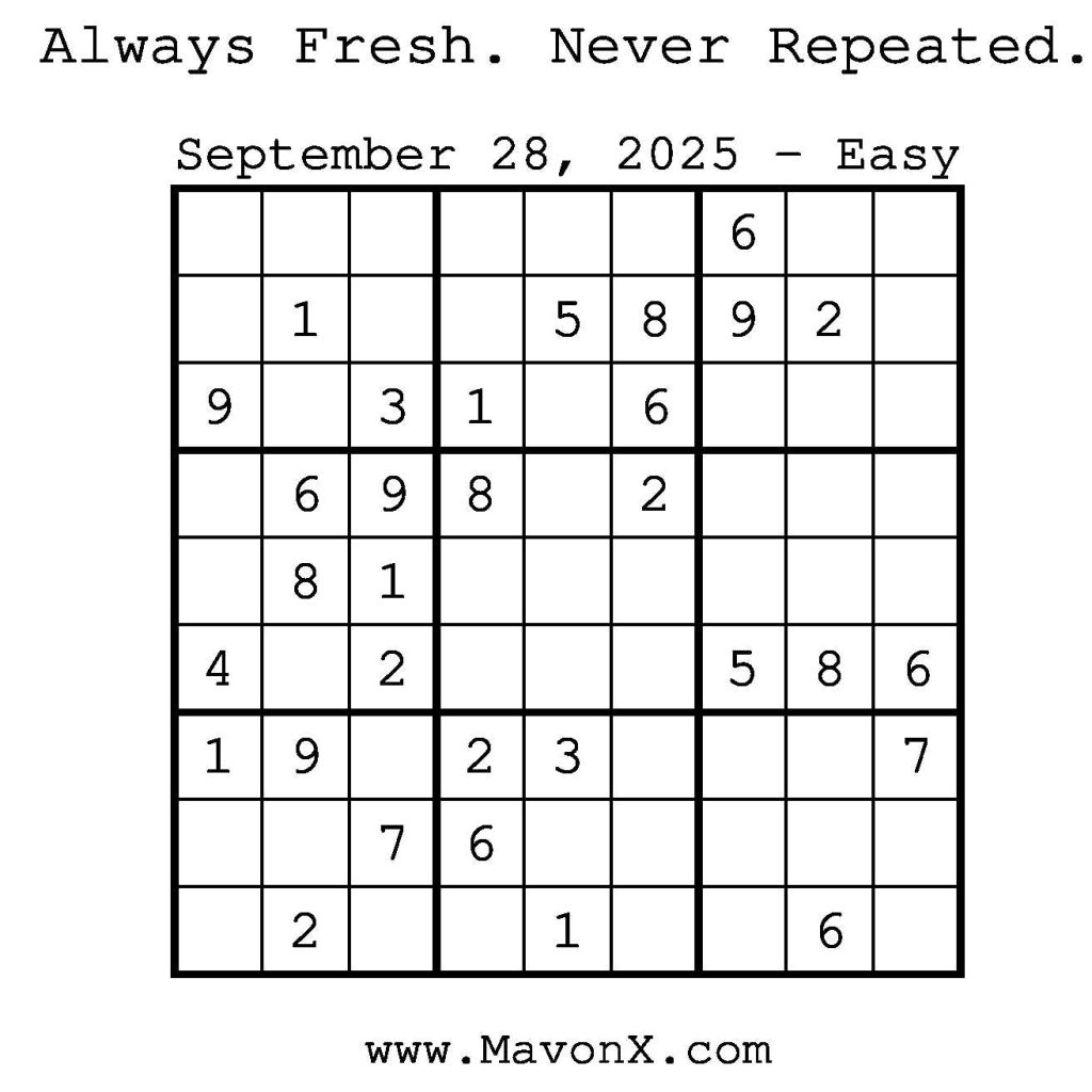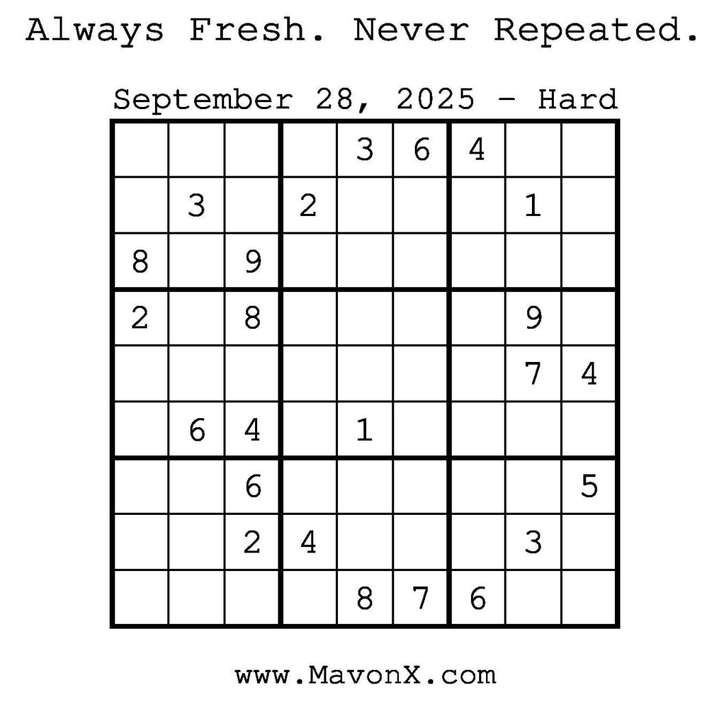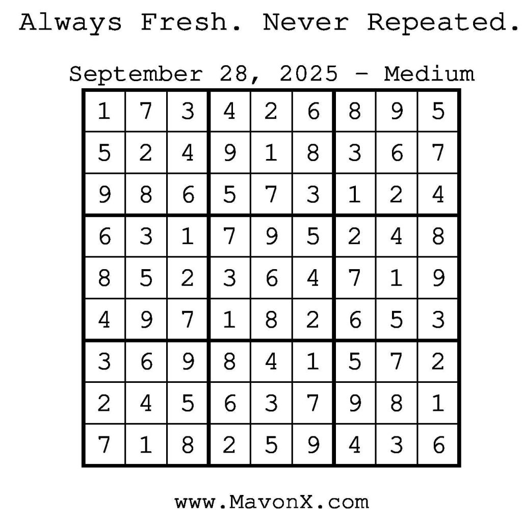 Puzzles of the Day – September 28, 2025 Post author:admin Post published:September 28, 2025 Post category:Free Stuff / Puzzle of the Day / Puzzle of the Day Solutions / Solutions Post comments:0 Comments Check out our books on Amazon! Check out our books on Barnes and Noble! Check out our books on Etsy! Easy Sudoku Coach Link Medium Sudoku Coach Link Hard Sudoku Coach Link Show Solution You Might Also Like Puzzles of the Day – September 10, 2024 September 10, 2024 Puzzles of the Day – September 3, 2024 September 3, 2024 Puzzles of the Day – December 03, 2025 December 3, 2025 Leave a Reply Cancel replyCommentEnter your name or username to comment Enter your email address to comment Enter your website URL (optional) Save my name, email, and website in this browser for the next time I comment.