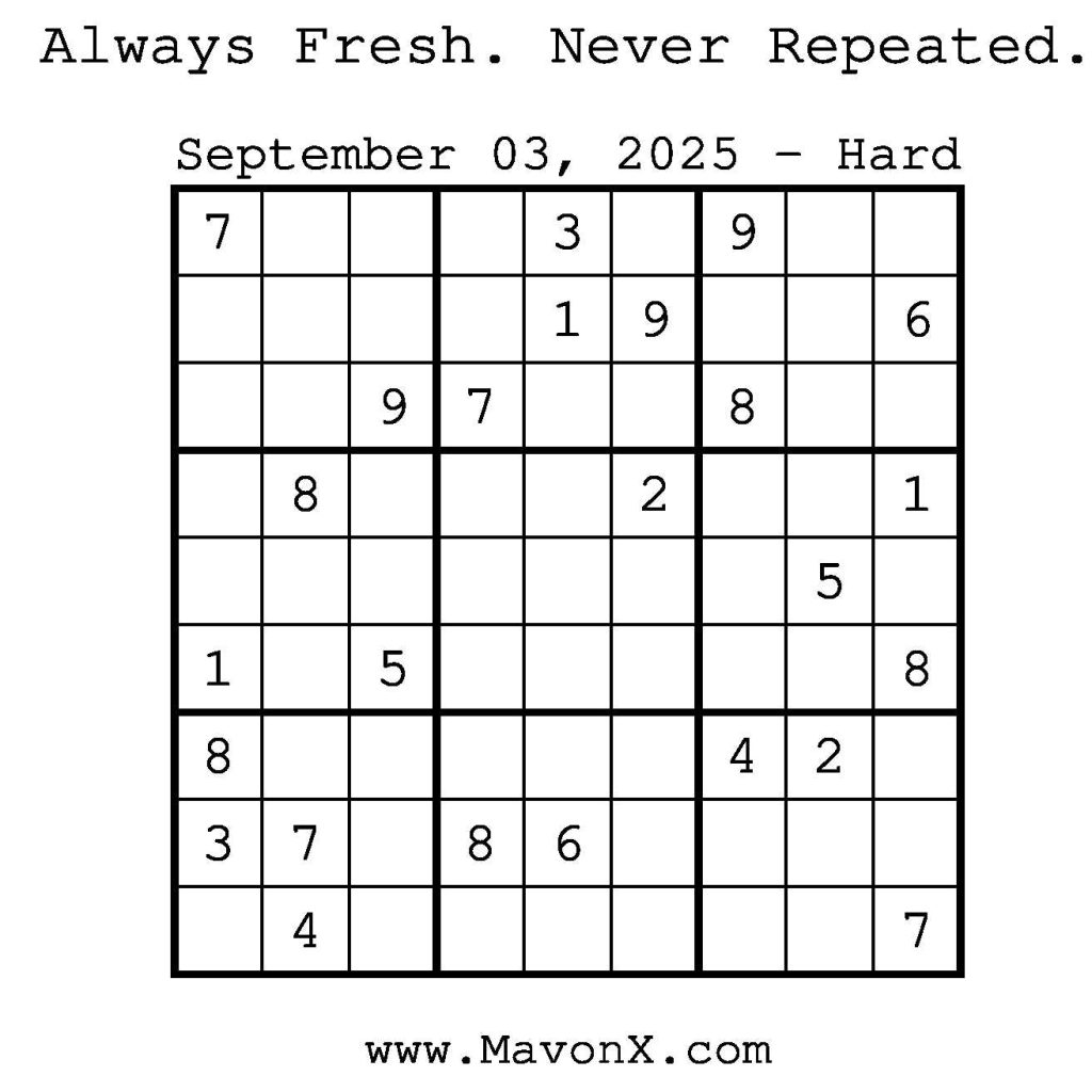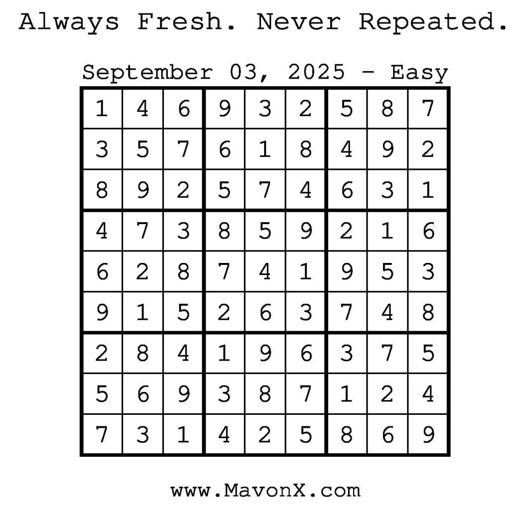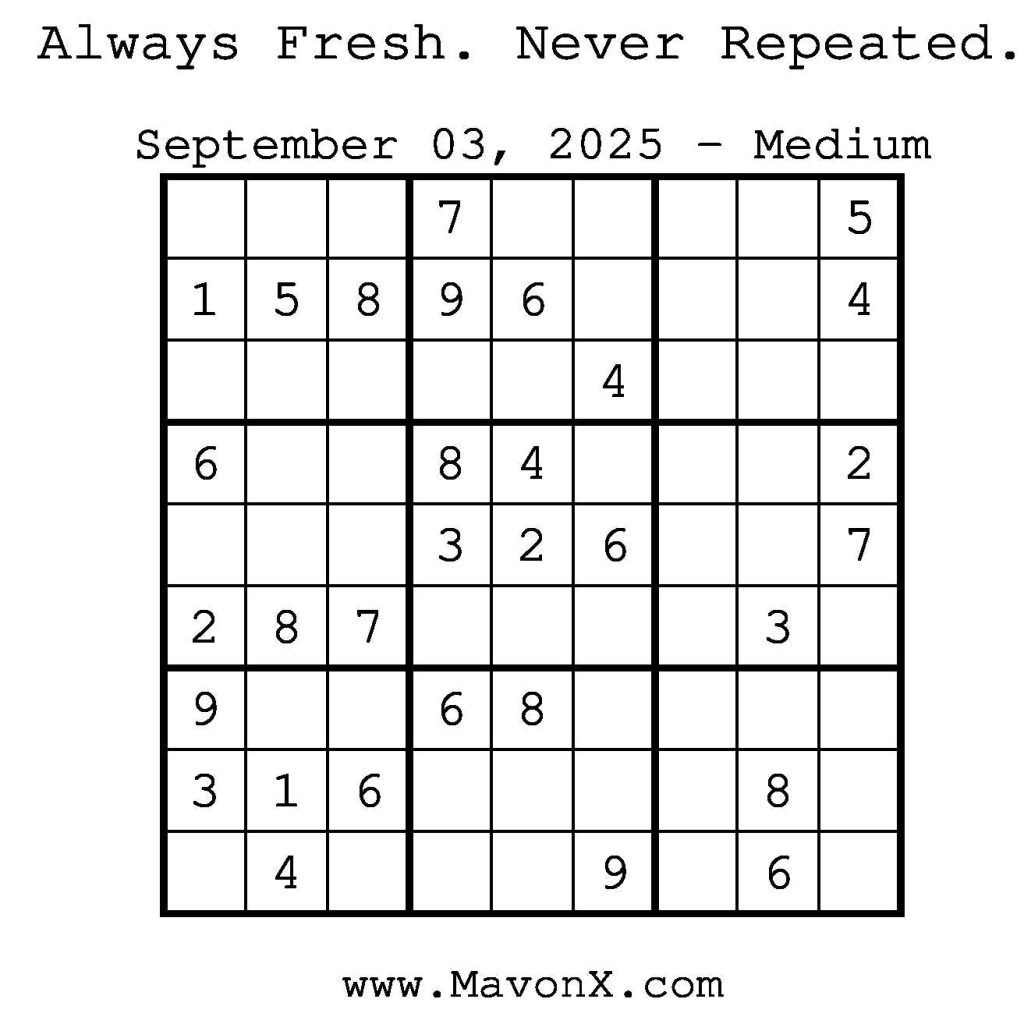 Puzzles of the Day – September 3, 2025 Post author:admin Post published:September 2, 2025 Post category:Free Stuff / Puzzle of the Day / Puzzle of the Day Solutions / Solutions Post comments:0 Comments Check out our books on Amazon! Check out our books on Barnes and Noble! Check out our books on Etsy! Easy Sudoku Coach Link Medium Sudoku Coach Link Hard Sudoku Coach Link Show Solution You Might Also Like Puzzles of the Day – November 4, 2025 November 3, 2025 Puzzles of the Day – January 8, 2025 January 8, 2025 Puzzles of the Day – November 18, 2025 November 17, 2025 Leave a Reply Cancel replyCommentEnter your name or username to comment Enter your email address to comment Enter your website URL (optional) Save my name, email, and website in this browser for the next time I comment.