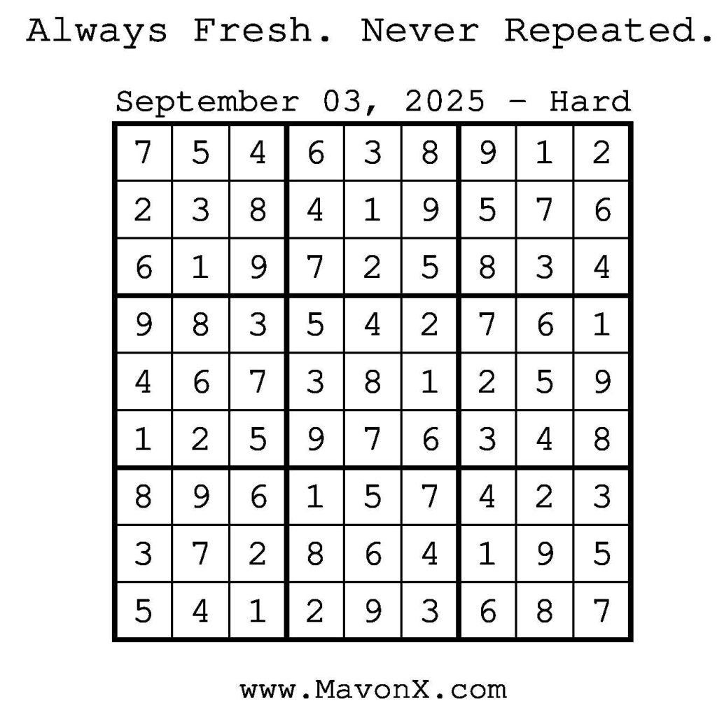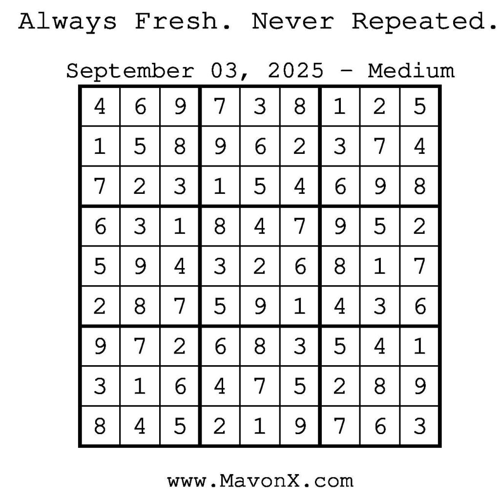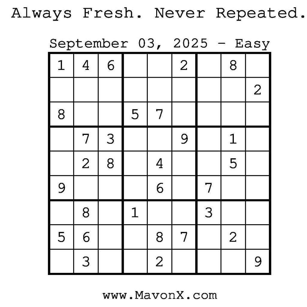 Puzzles of the Day – September 3, 2025 Post author:admin Post published:September 2, 2025 Post category:Free Stuff / Puzzle of the Day / Puzzle of the Day Solutions / Solutions Post comments:0 Comments Check out our books on Amazon! Check out our books on Barnes and Noble! Check out our books on Etsy! Easy Sudoku Coach Link Medium Sudoku Coach Link Hard Sudoku Coach Link Show Solution You Might Also Like Puzzles of the Day – November 4, 2025 November 3, 2025 Puzzles of the Day – January 8, 2025 January 8, 2025 Puzzles of the Day – November 18, 2025 November 17, 2025 Leave a Reply Cancel replyCommentEnter your name or username to comment Enter your email address to comment Enter your website URL (optional) Save my name, email, and website in this browser for the next time I comment.