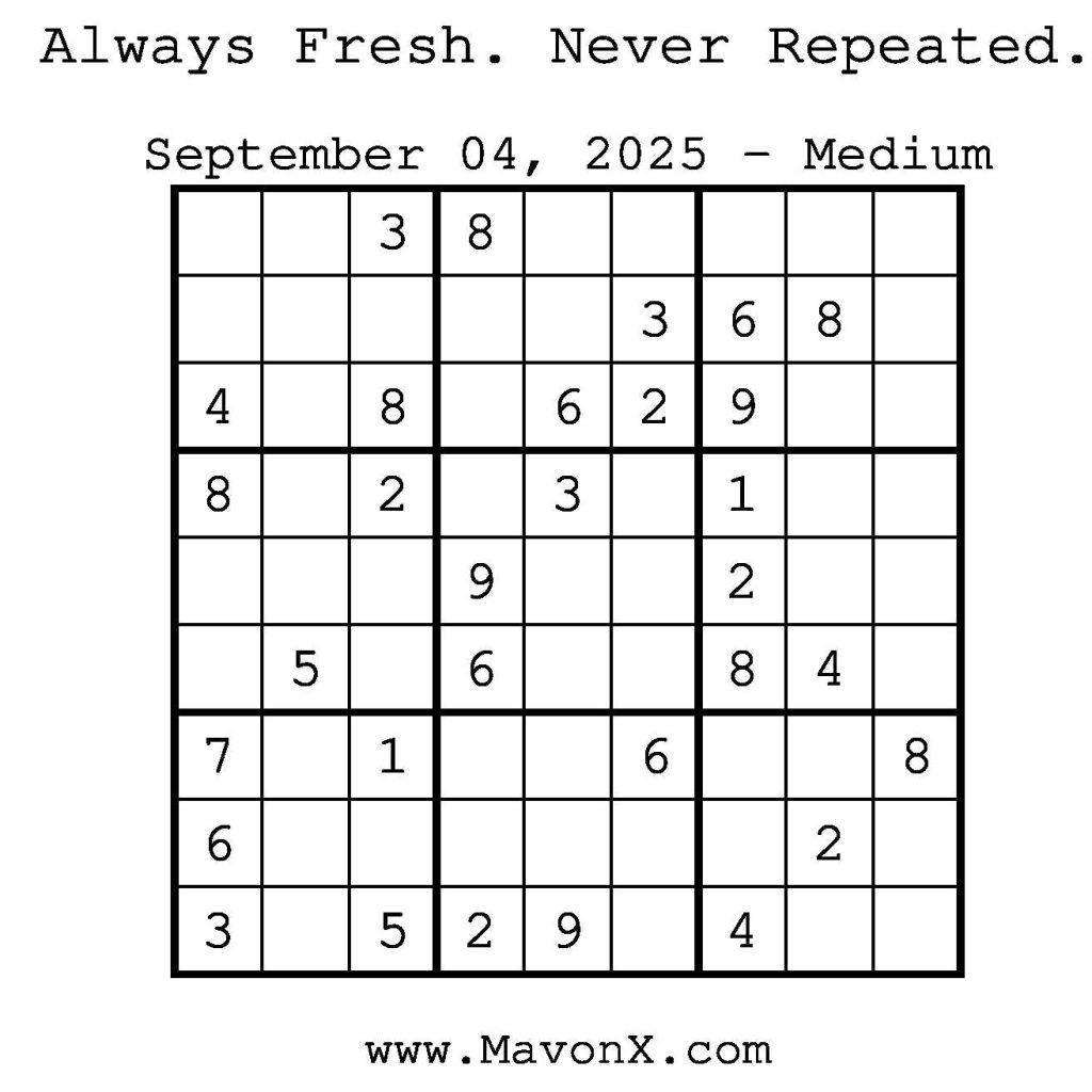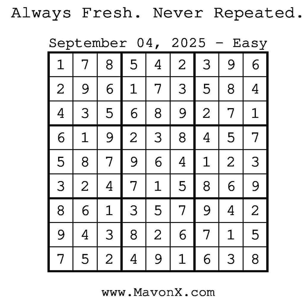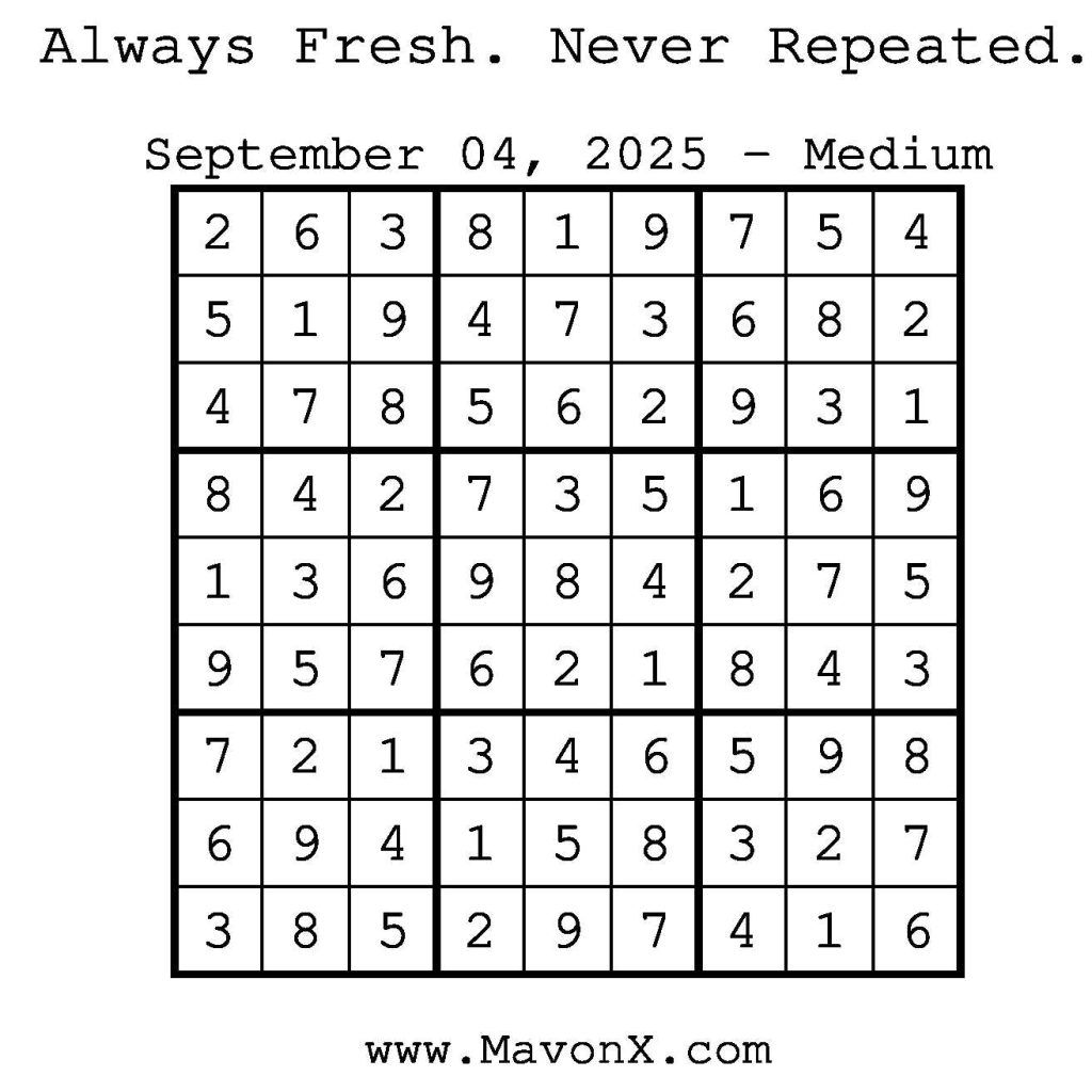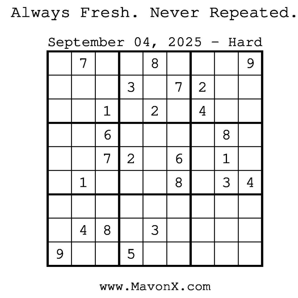 Puzzles of the Day – September 4, 2025 Post author:admin Post published:September 3, 2025 Post category:Free Stuff / Puzzle of the Day / Puzzle of the Day Solutions / Solutions Post comments:0 Comments Check out our books on Amazon! Check out our books on Barnes and Noble! Check out our books on Etsy! Easy Sudoku Coach Link Medium Sudoku Coach Link Hard Sudoku Coach Link Show Solution You Might Also Like Puzzle of the Day – July 4, 2024 July 4, 2024 Puzzles of the Day – March 19, 2026 March 18, 2026 Puzzles of the Day – August 31, 2024 August 31, 2024 Leave a Reply Cancel replyCommentEnter your name or username to comment Enter your email address to comment Enter your website URL (optional) Save my name, email, and website in this browser for the next time I comment.