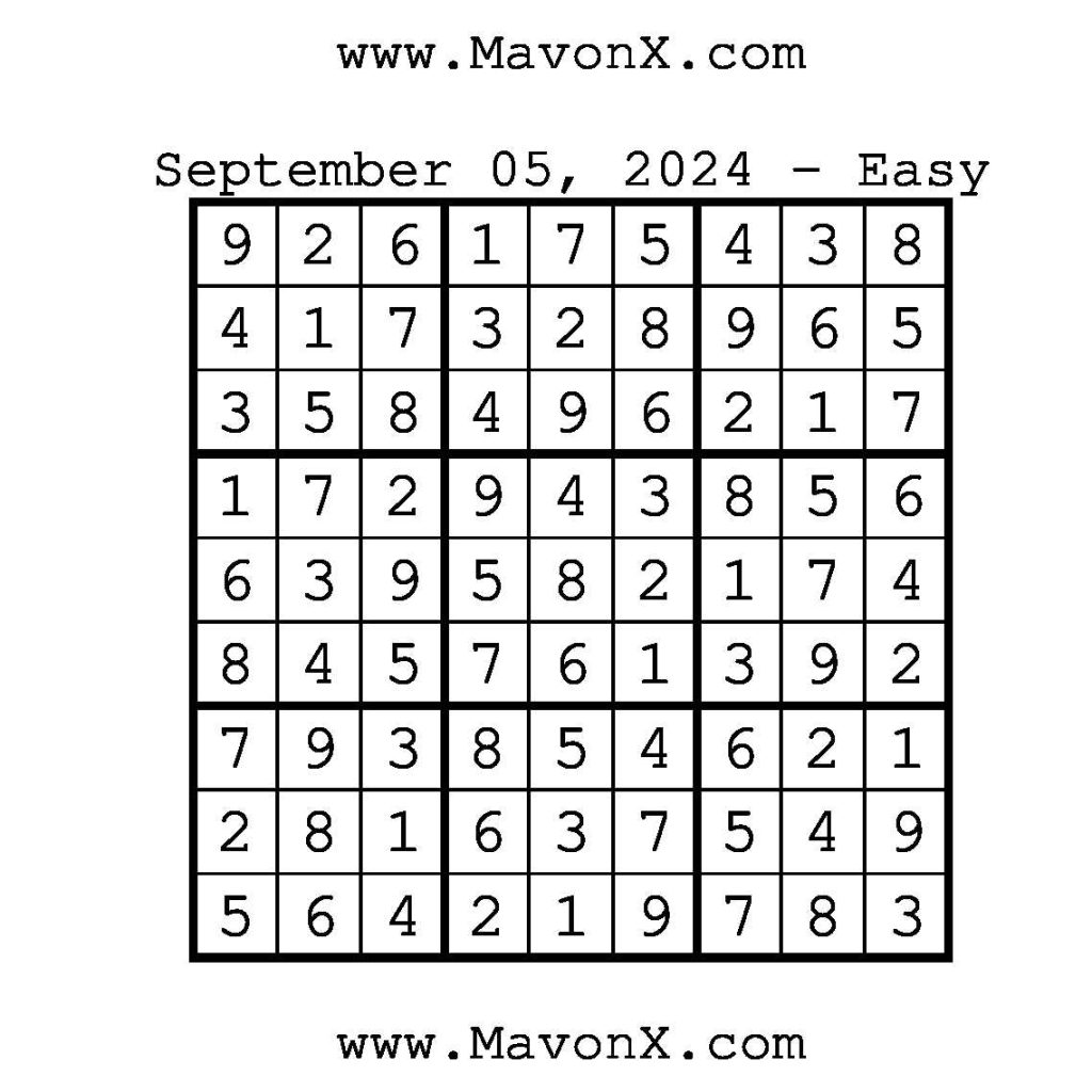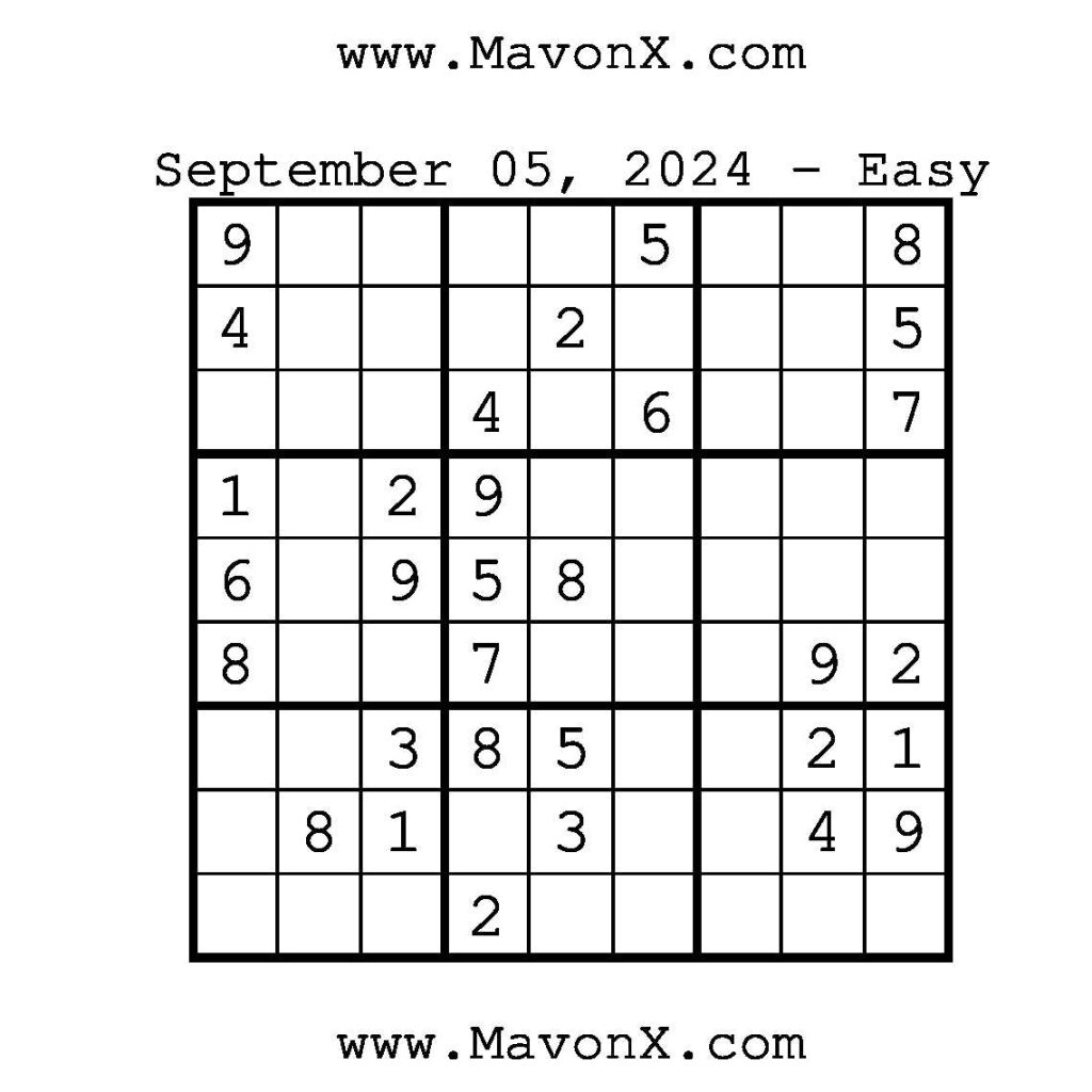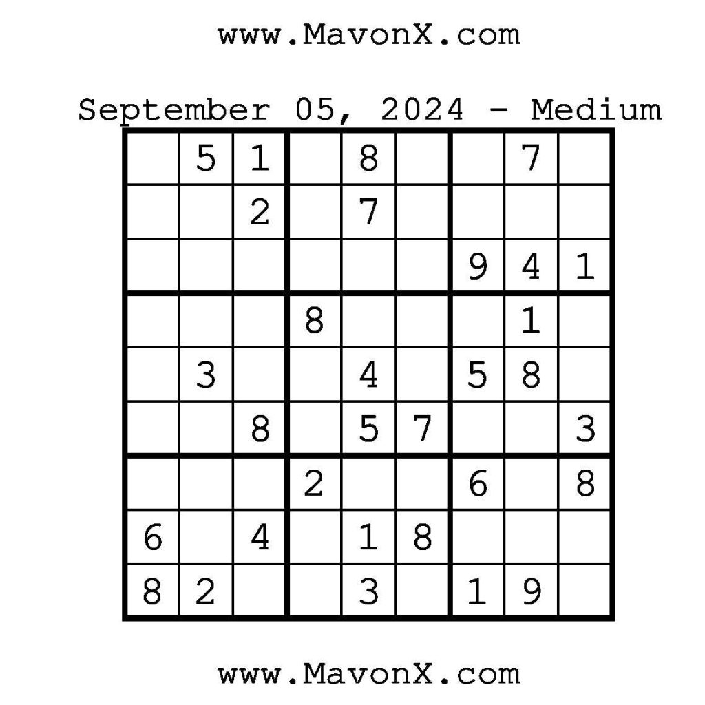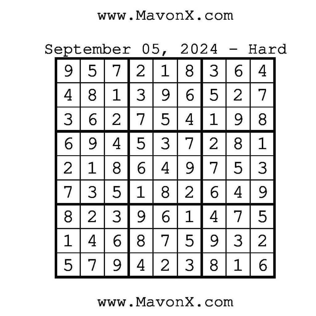 Puzzles of the Day – September 5, 2024 Post author:admin Post published:September 5, 2024 Post category:Free Stuff / Puzzle of the Day / Puzzle of the Day Solutions / Solutions Post comments:0 Comments Check out our books on Amazon!!!!! Easy Sudoku Coach Link Medium Sudoku Coach Link Hard Sudoku Coach Link Show Solution You Might Also Like Puzzles of the Day – September 26, 2024 September 26, 2024 Puzzles of the Day – October 22, 2024 October 21, 2024 Puzzles of the Day – October 11, 2024 October 11, 2024 Leave a Reply Cancel replyCommentEnter your name or username to comment Enter your email address to comment Enter your website URL (optional) Save my name, email, and website in this browser for the next time I comment.