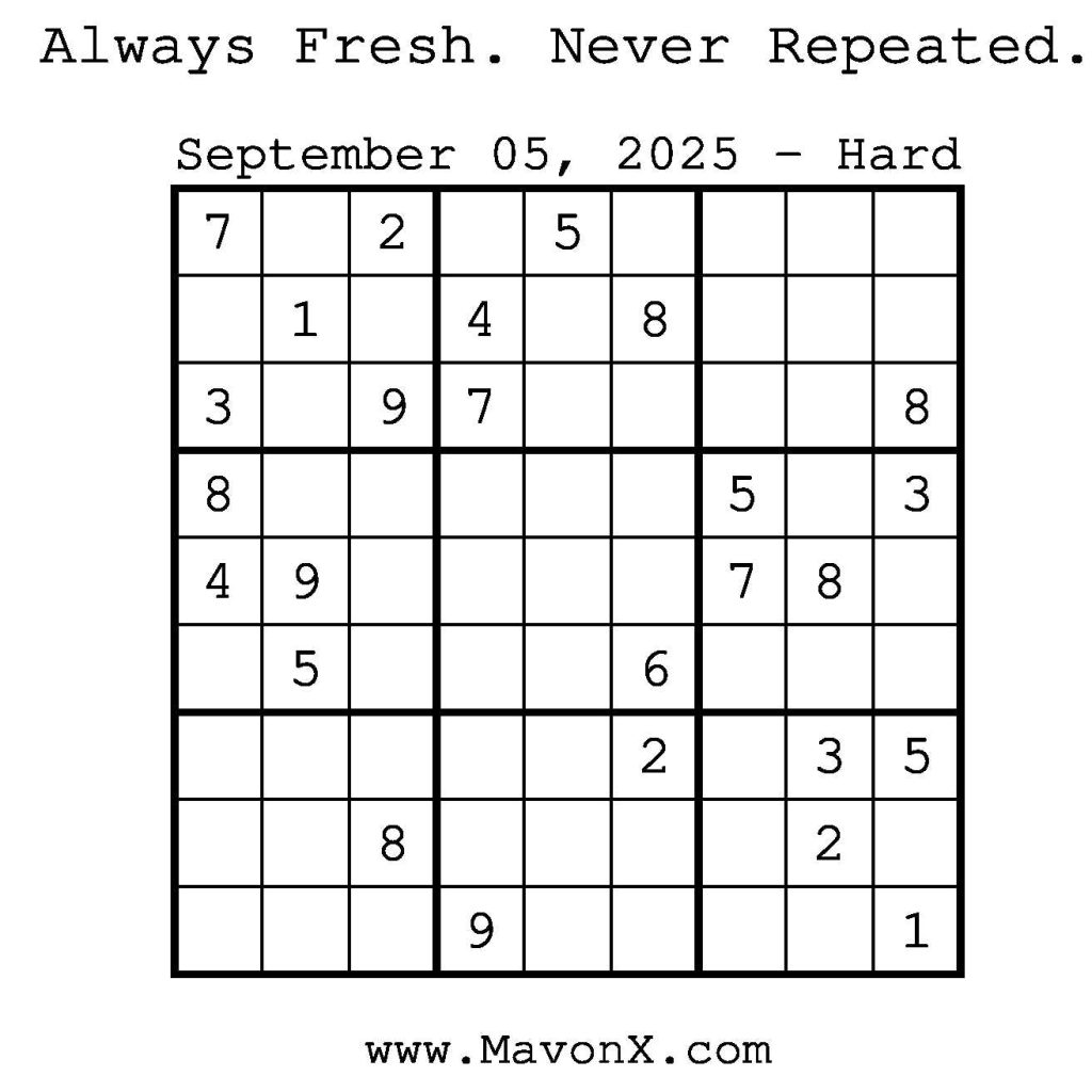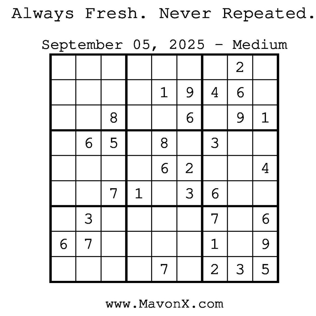 Puzzles of the Day – September 5, 2025 Post author:admin Post published:September 4, 2025 Post category:Free Stuff / Puzzle of the Day / Puzzle of the Day Solutions / Solutions Post comments:0 Comments Check out our books on Amazon! Check out our books on Barnes and Noble! Check out our books on Etsy! Easy Sudoku Coach Link Medium Sudoku Coach Link Hard Sudoku Coach Link Show Solution You Might Also Like Puzzles of the Day – February 1, 2026 February 1, 2026 Puzzles of the Day – January 2, 2025 January 3, 2025 Puzzles of the Day – November 26, 2024 November 26, 2024 Leave a Reply Cancel replyCommentEnter your name or username to comment Enter your email address to comment Enter your website URL (optional) Save my name, email, and website in this browser for the next time I comment.