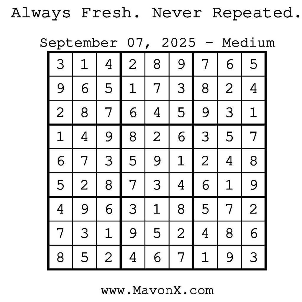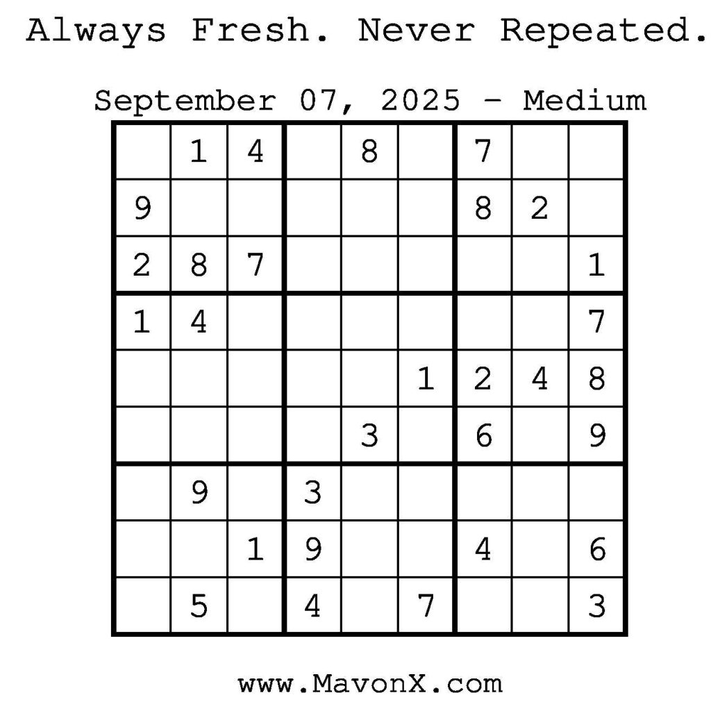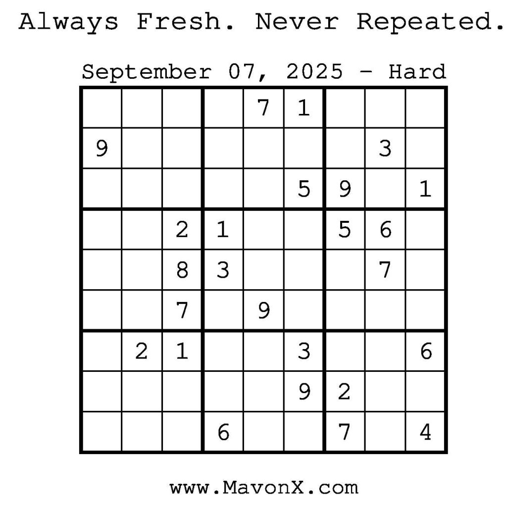 Puzzles of the Day – September 7, 2025 Post author:admin Post published:September 6, 2025 Post category:Free Stuff / Puzzle of the Day / Puzzle of the Day Solutions / Solutions Post comments:0 Comments Check out our books on Amazon! Check out our books on Barnes and Noble! Check out our books on Etsy! Easy Sudoku Coach Link Medium Sudoku Coach Link Hard Sudoku Coach Link Show Solution You Might Also Like Puzzles of the Day – September 9, 2024 September 9, 2024 Puzzles of the Day – September 22, 2025 September 21, 2025 Puzzles of the Day – December 28, 2025 December 27, 2025 Leave a Reply Cancel replyCommentEnter your name or username to comment Enter your email address to comment Enter your website URL (optional) Save my name, email, and website in this browser for the next time I comment.